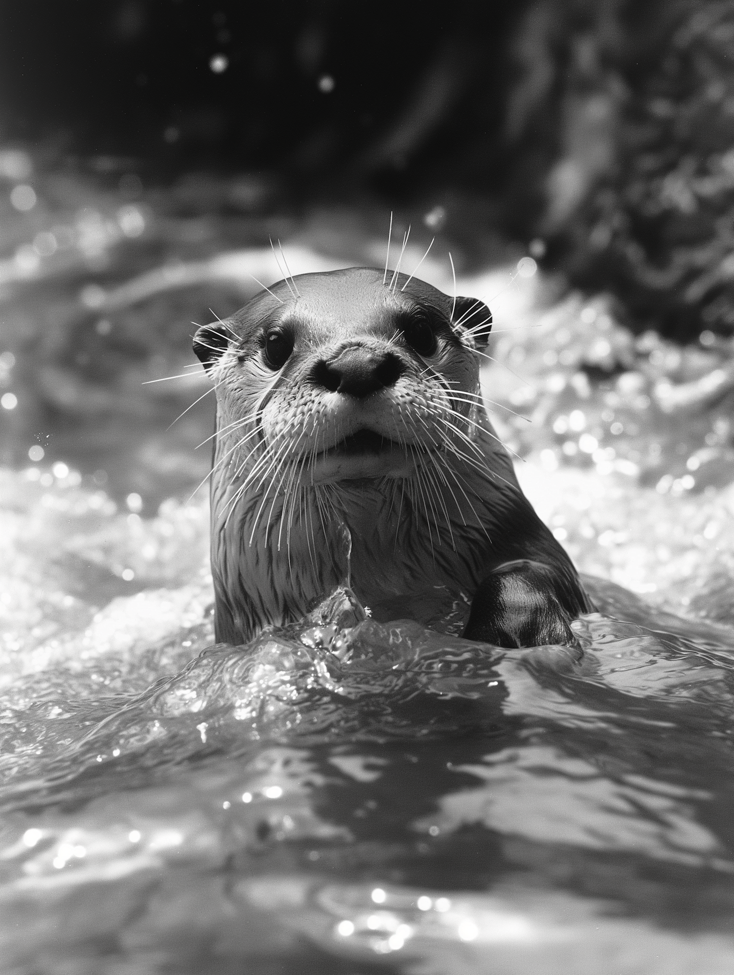 A curious otter peeks out of the water, its whiskers and wet fur glistening in the light, surrounded by rippling water.