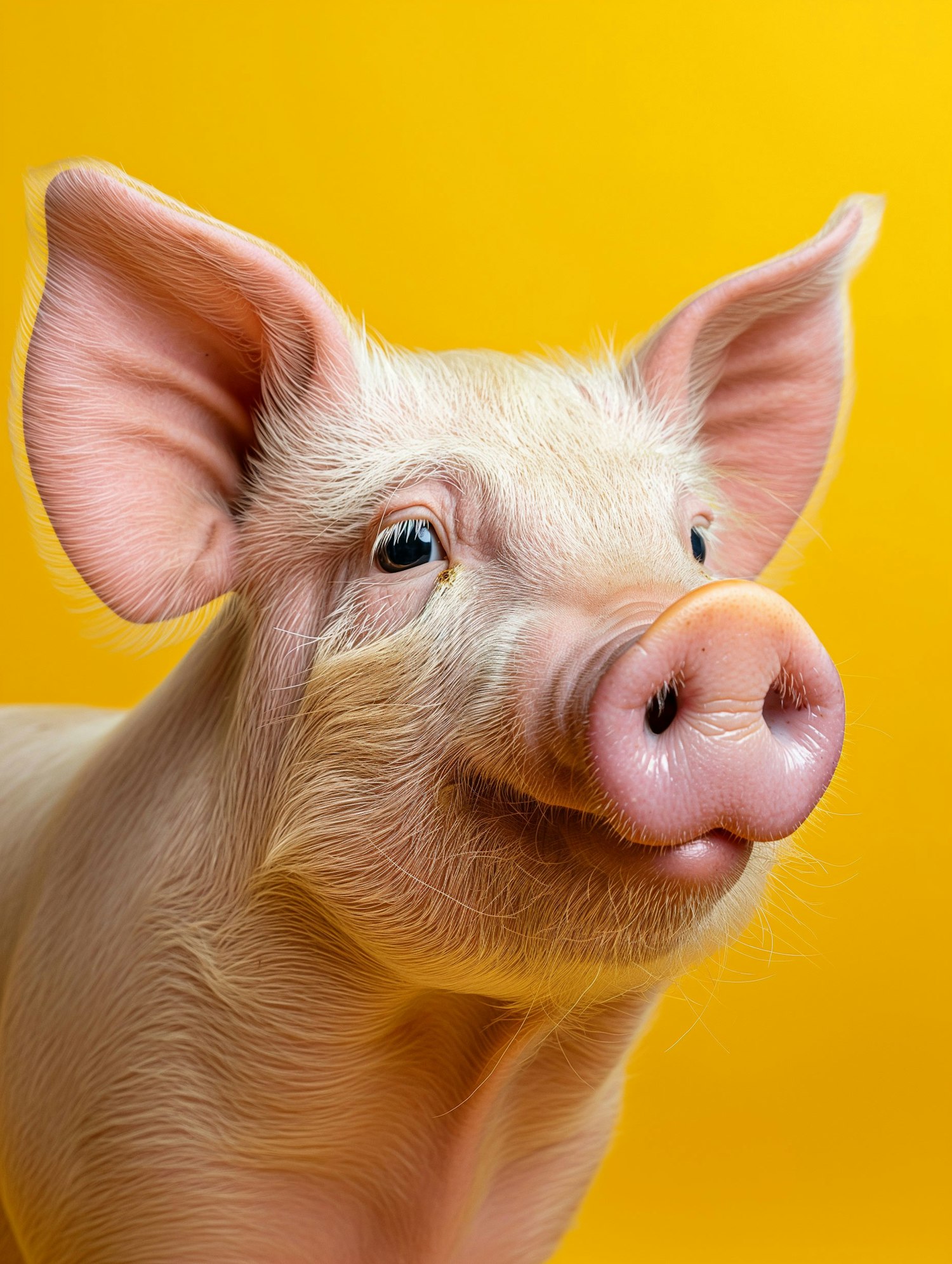 Adorable piglet with a pink snout against a vibrant yellow background, showcasing its curious and friendly expression.