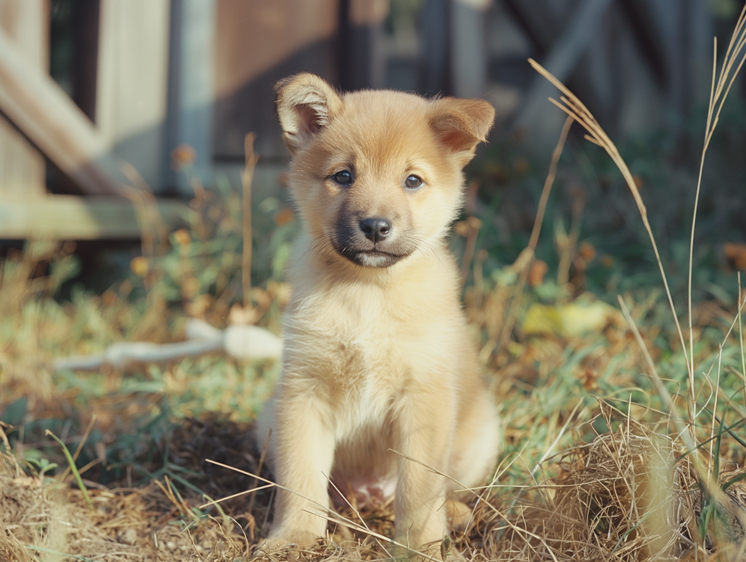Adorable light brown puppy sitting in a sunlit garden, surrounded by dry grasses and plants, with a curious gaze.