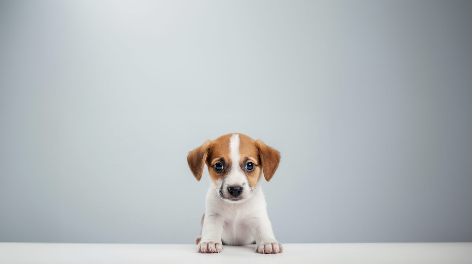 Adorable puppy with brown and white fur sitting on a white surface against a gray background, looking curiously at the camera.