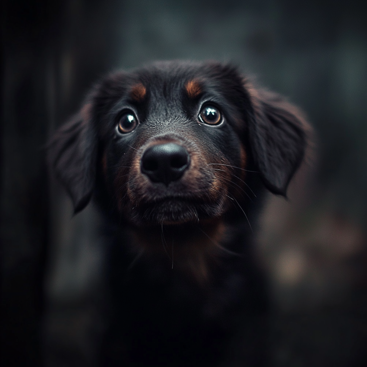 Adorable close-up of a black and brown puppy with expressive eyes, capturing its curious and innocent gaze.