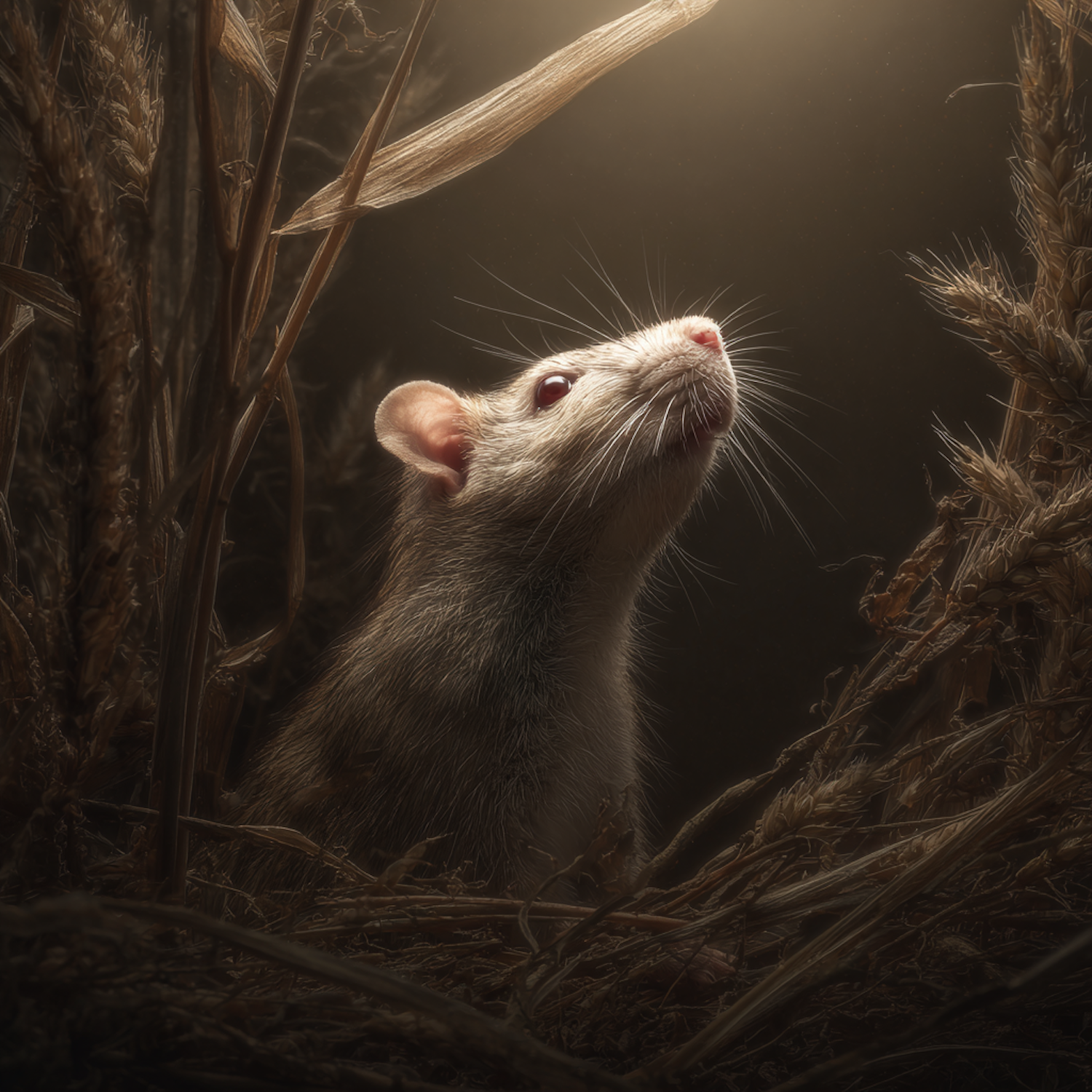 A curious rat illuminated by warm light, surrounded by dried plants, creating a serene and natural atmosphere.