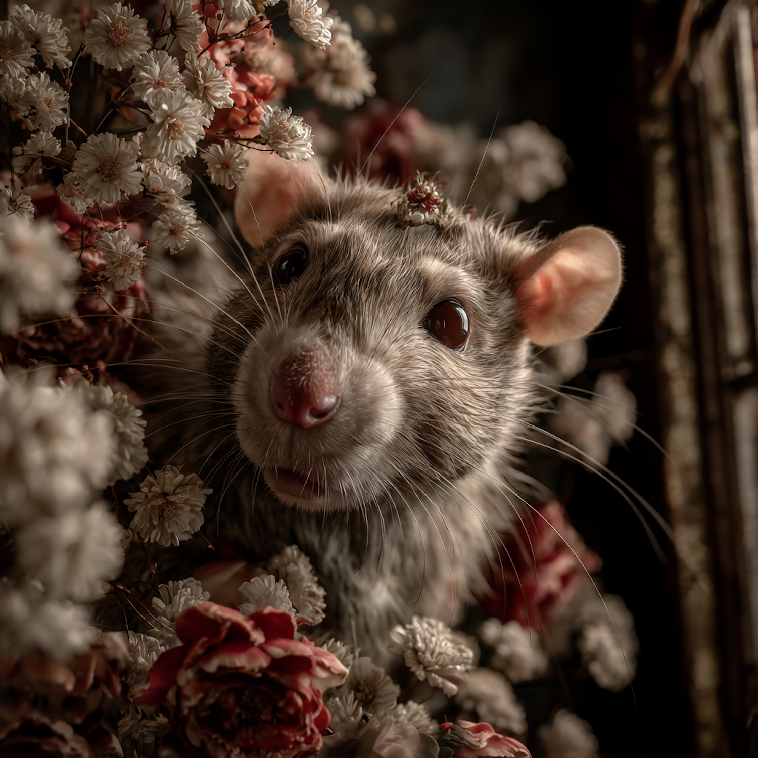 A curious rat peeks out from a bed of red and white flowers, its expressive eyes and soft fur highlighted by warm lighting.