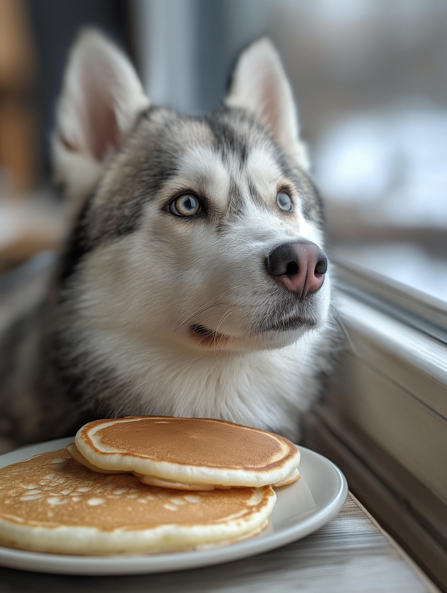 Siberian Husky with blue eyes gazes out a window beside a plate of fluffy pancakes, creating a cozy and inviting scene.
