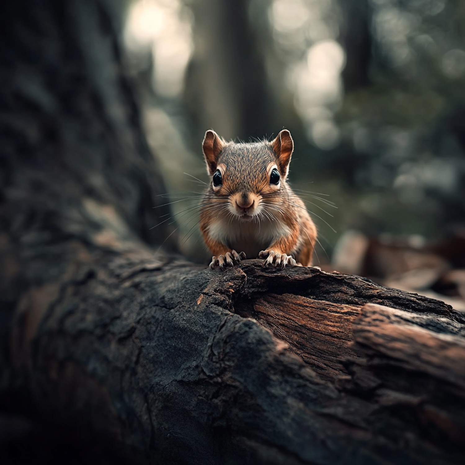 Adorable squirrel perched on a tree branch in a forest, with soft lighting highlighting its fur and inquisitive expression.