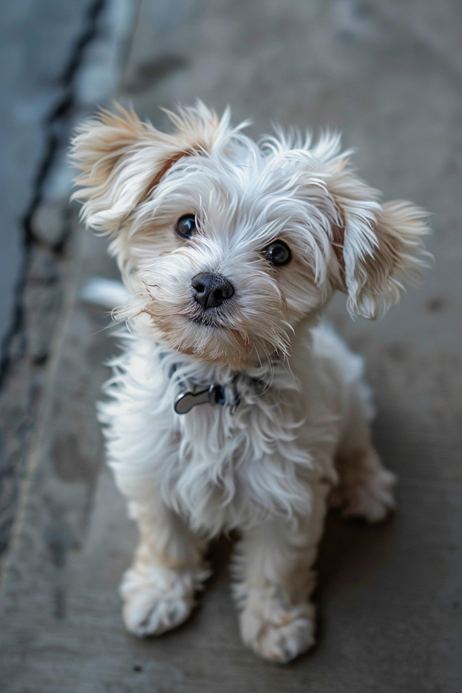 Adorable fluffy white dog with a curious expression, sitting on a concrete surface. Perfect pet portrait with a cute collar and tag.