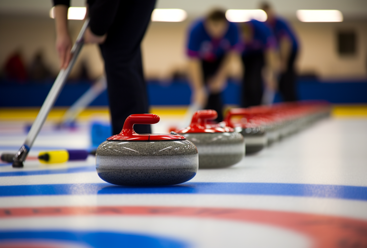 Curling stones with red handles lined up on an ice rink, players in blue uniforms preparing for a match.