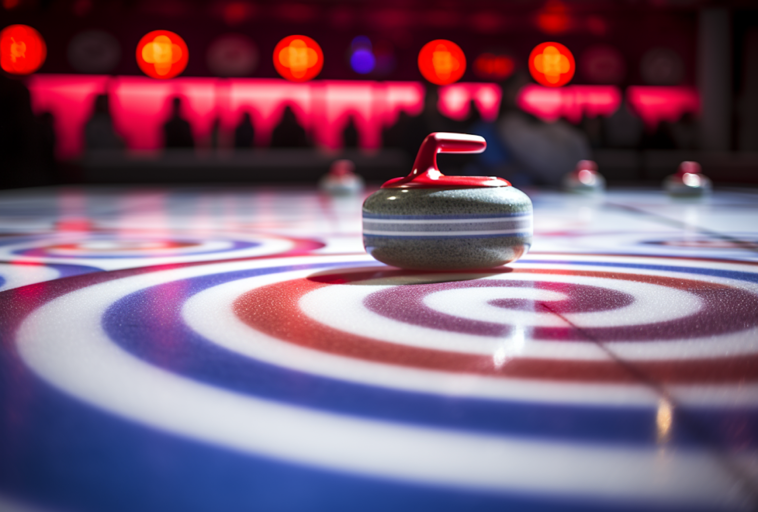 Curling stone on ice with vibrant red, white, and blue target, set against a backdrop of glowing red lights.