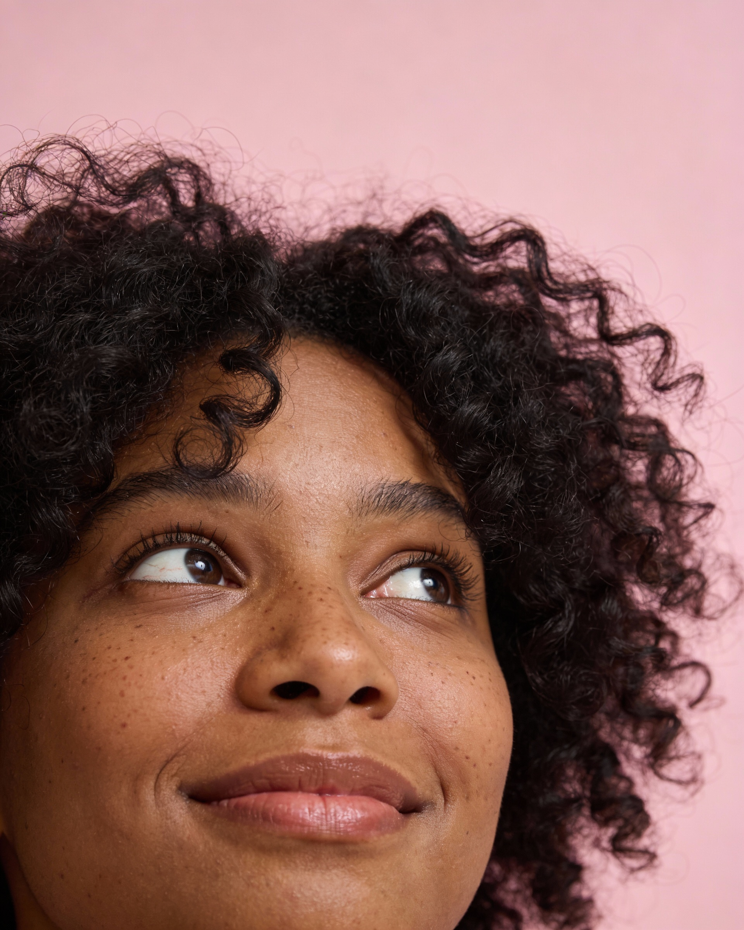 Ultra realistic close-up portrait photography, high-end natural beauty campaign, clean minimal composition, seamless solid pastel pink studio background. Very tight framing, face filling most of the frame, forehead and hair visible, chin slightly cropped. Model with deep dark brown complexion, warm undertone, natural skin texture with visible pores and subtle freckles, realistic skin imperfections, no heavy retouching, no plastic skin. Expression:, cheeks relaxed, playful thoughtful mood. Eyes open and looking up to the right (gaze off camera), soft curious expression. Hair: natural afro textured hair, big voluminous curls/coils, airy soft texture, lots of movement, a few thick curly strands falling across the face, realistic curl definition, natural hairline. Lighting: soft diffused daylight / studio natural light, gentle highlights on skin, minimal shadows, crisp sharp focus, editorial portrait look, 85mm lens, f/2.8, high resolution.
