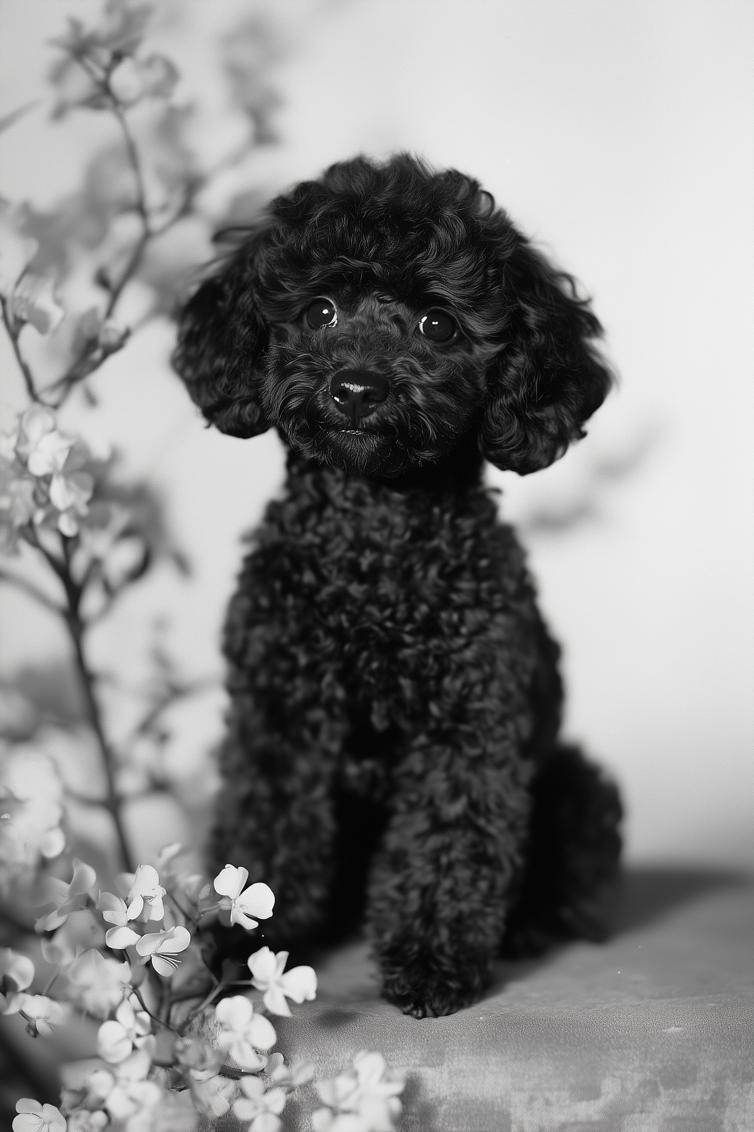 Adorable black poodle puppy with curly fur and bright eyes, surrounded by delicate white flowers in a classic monochrome setting.