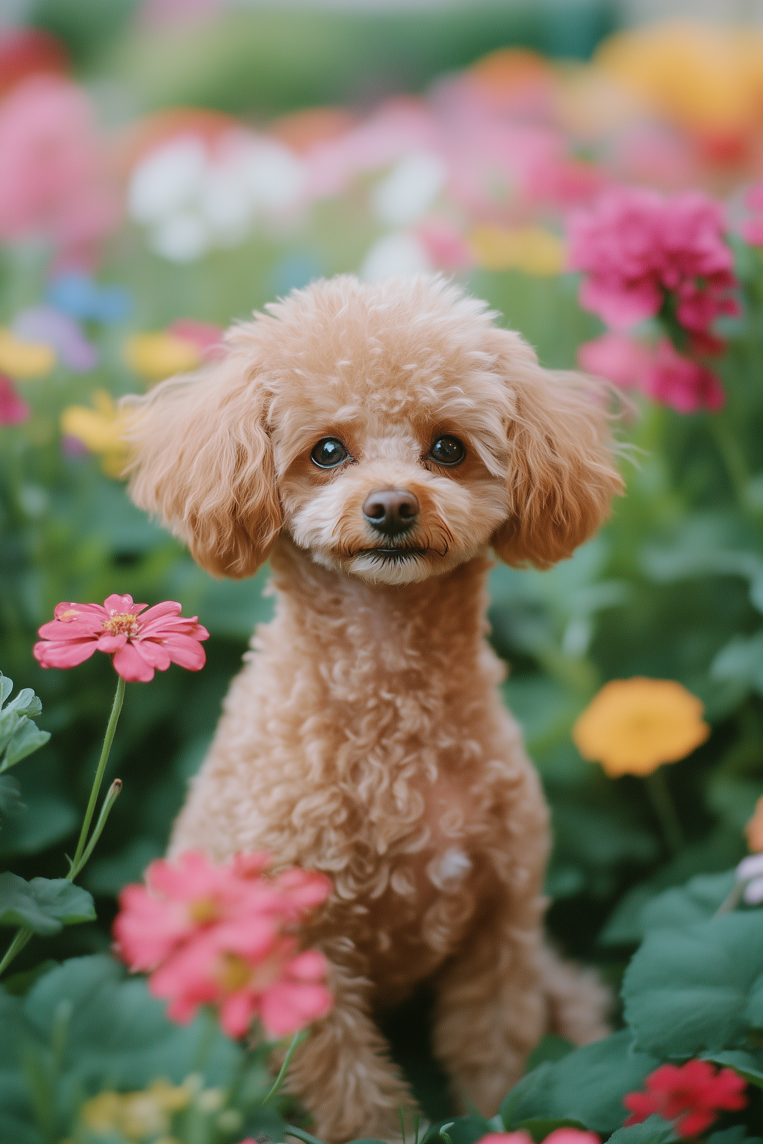 Adorable curly-haired dog in a colorful flower garden, surrounded by vibrant blooms and lush greenery.