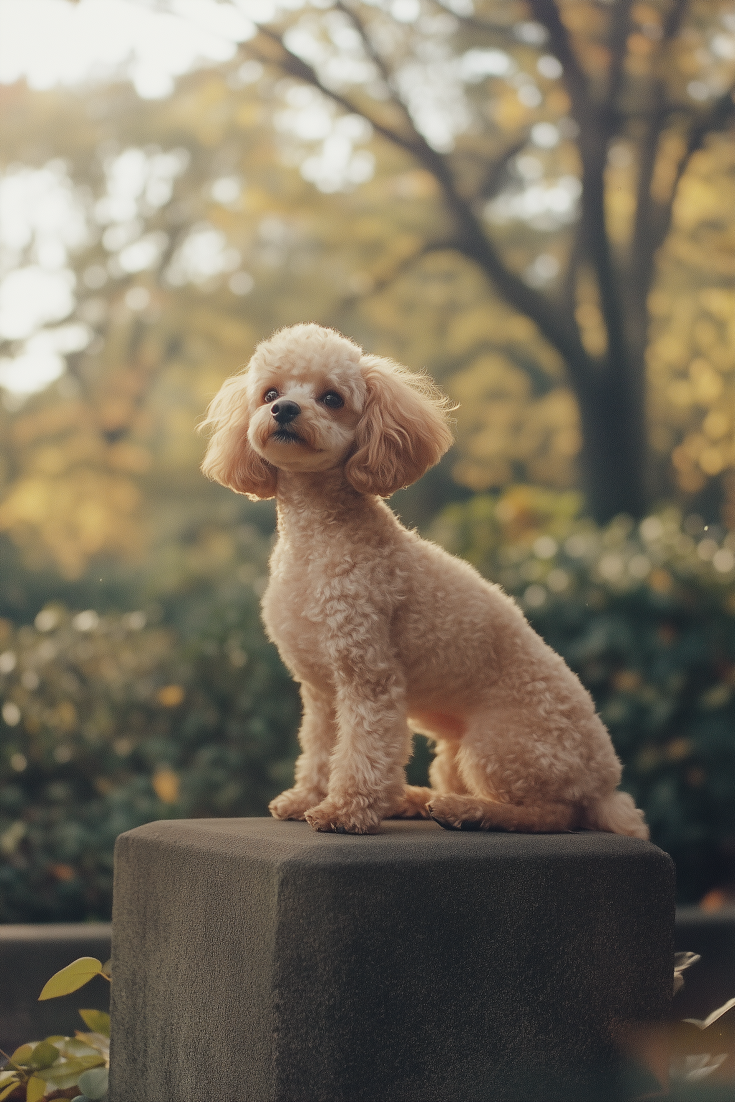 Adorable poodle with curly fur sits on a stone pedestal in a serene park setting, surrounded by soft, warm lighting.