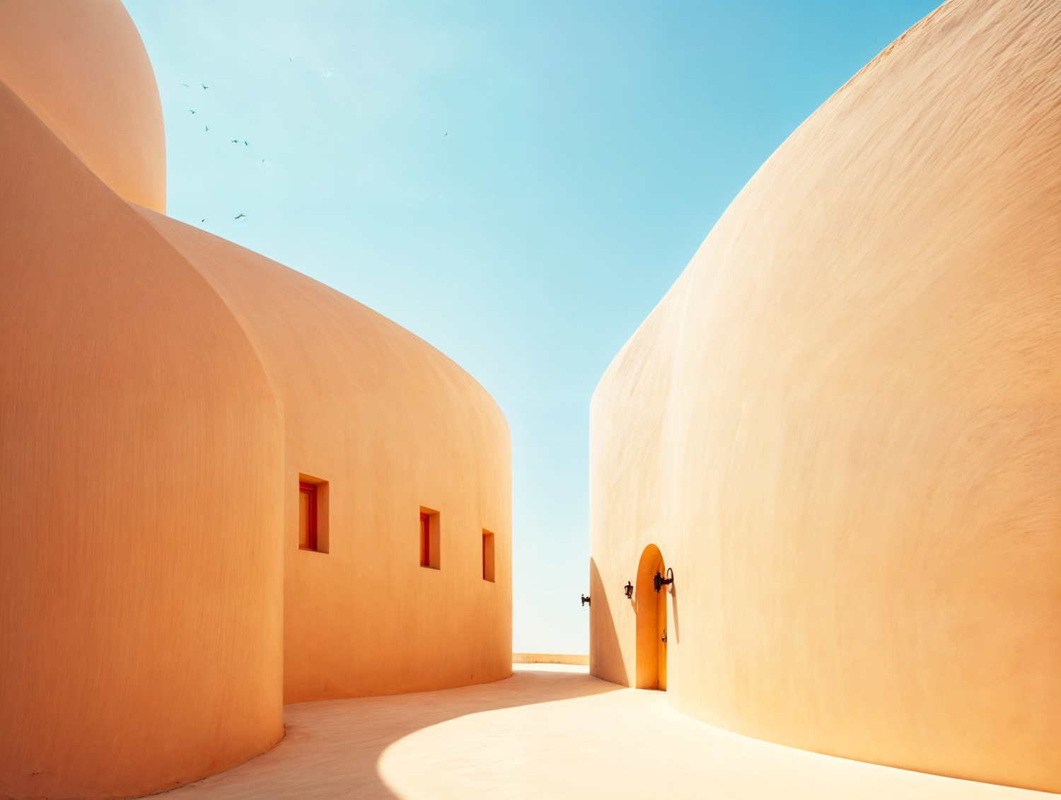 Curved beige buildings with minimalist design against a bright blue sky, featuring small windows and an arched doorway.