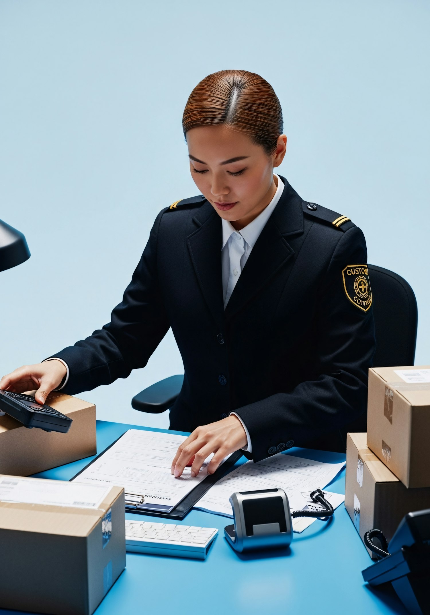 A customs officer in uniform processes documents and packages at a desk, showcasing a professional and organized workspace.