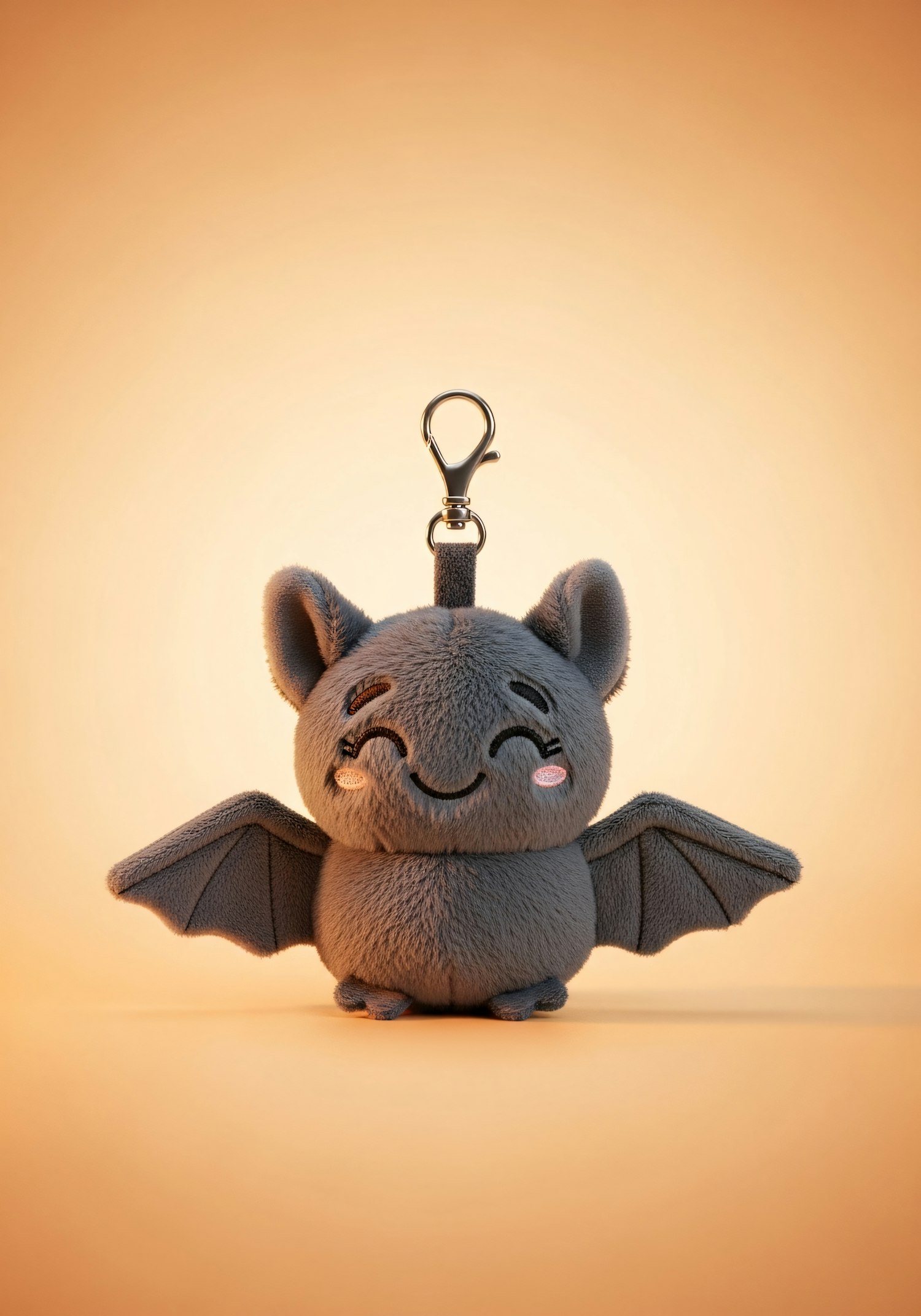 Adorable gray plush bat keychain with a smiling face and soft texture, set against a warm orange gradient background.
