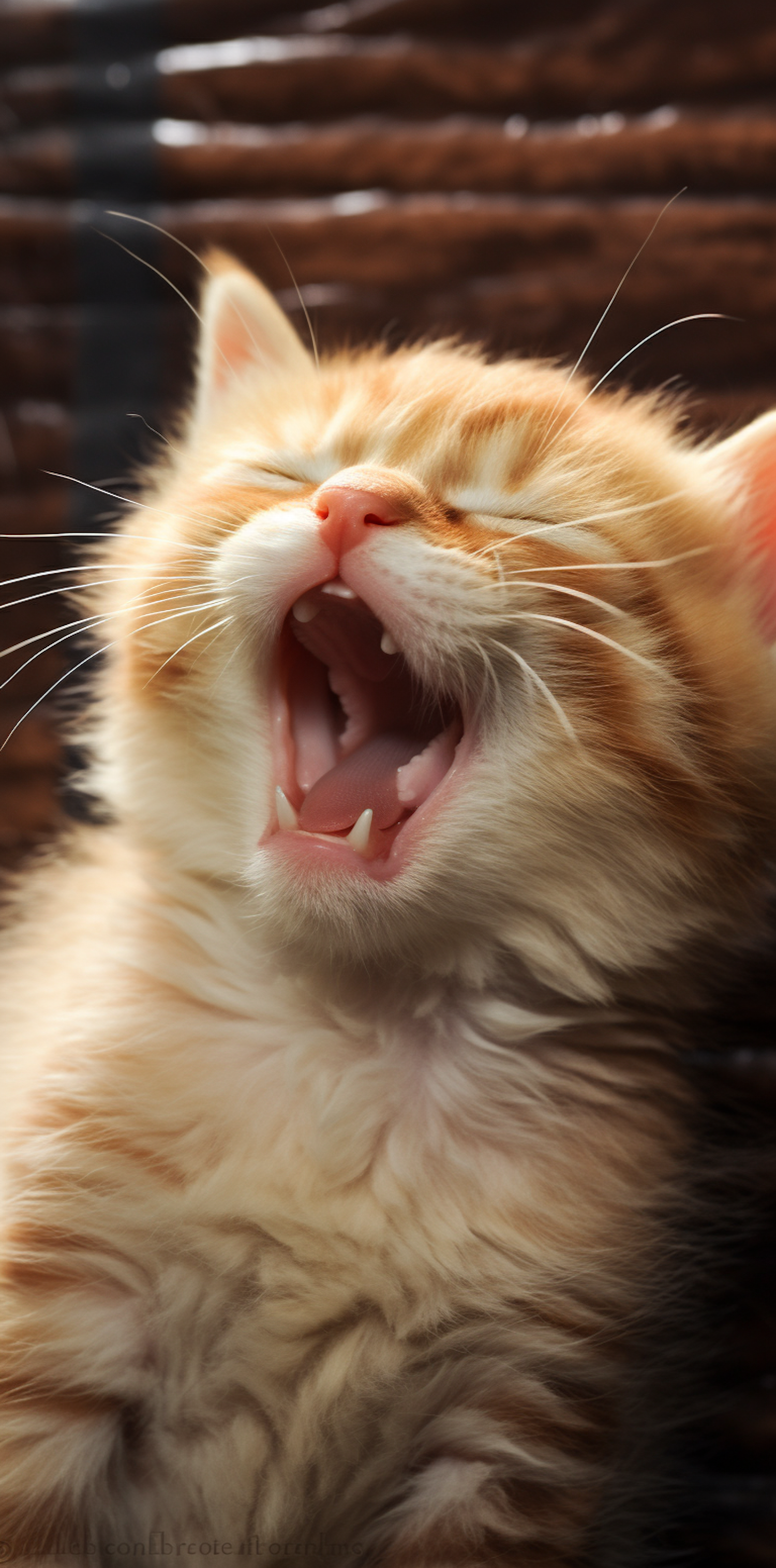 Adorable orange and white kitten yawning with eyes closed, showcasing tiny teeth and fluffy fur in a warm, cozy setting.