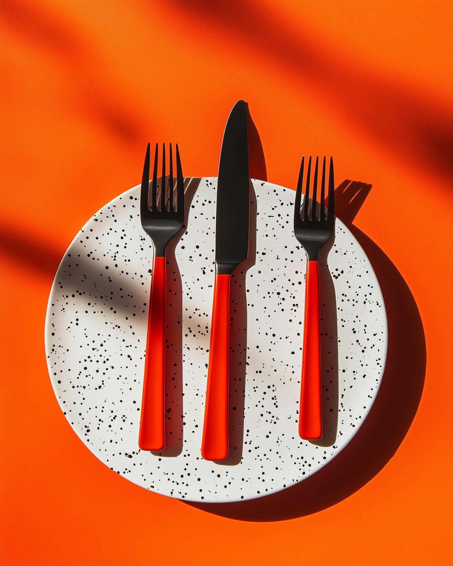 Artistic cutlery arrangement on a speckled plate with a vibrant orange background. Red-handled forks and knife create a striking visual.