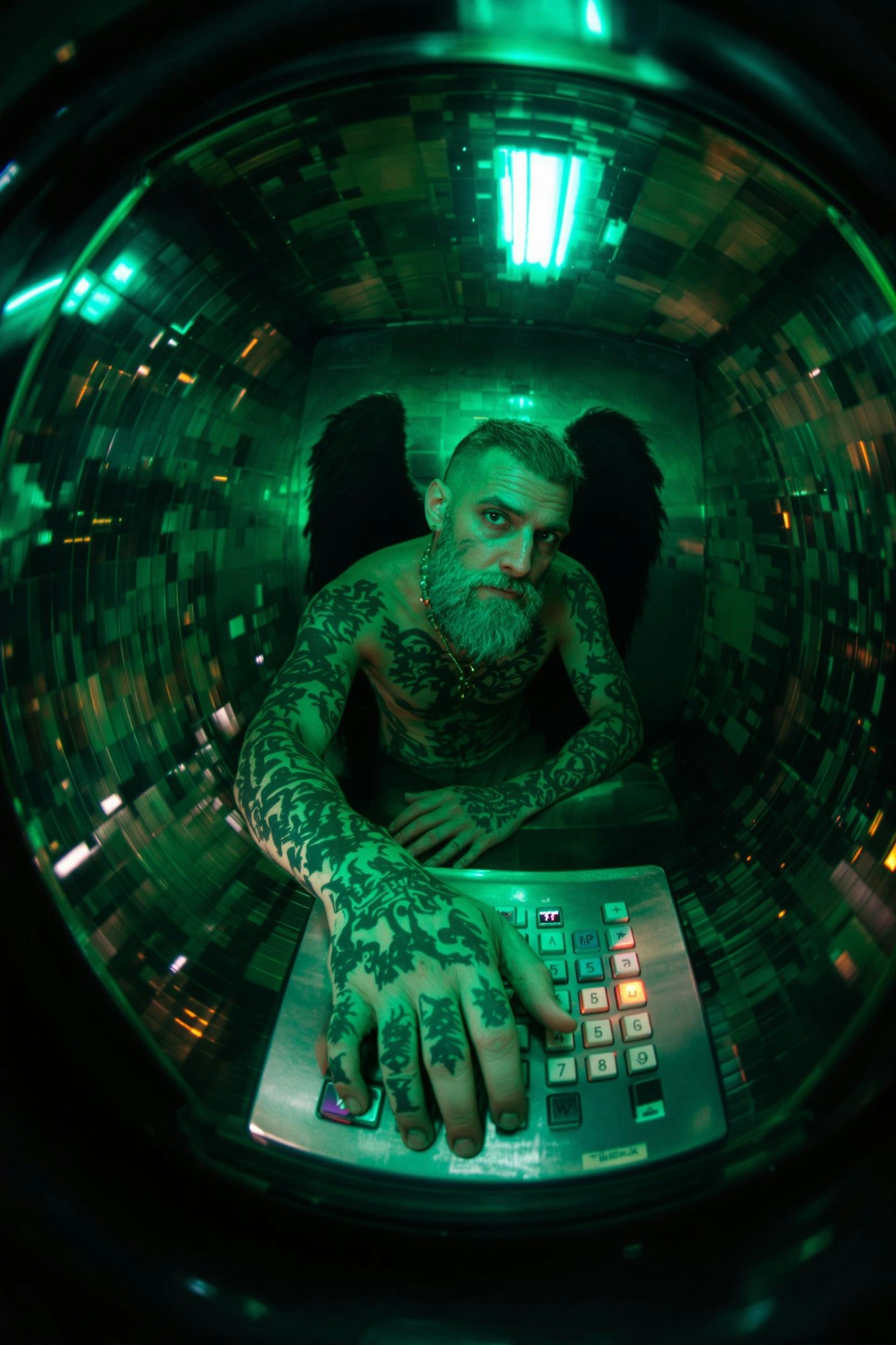 Tattooed man with black angel wings in a green-lit futuristic setting, leaning on a keypad with a reflective mosaic background.