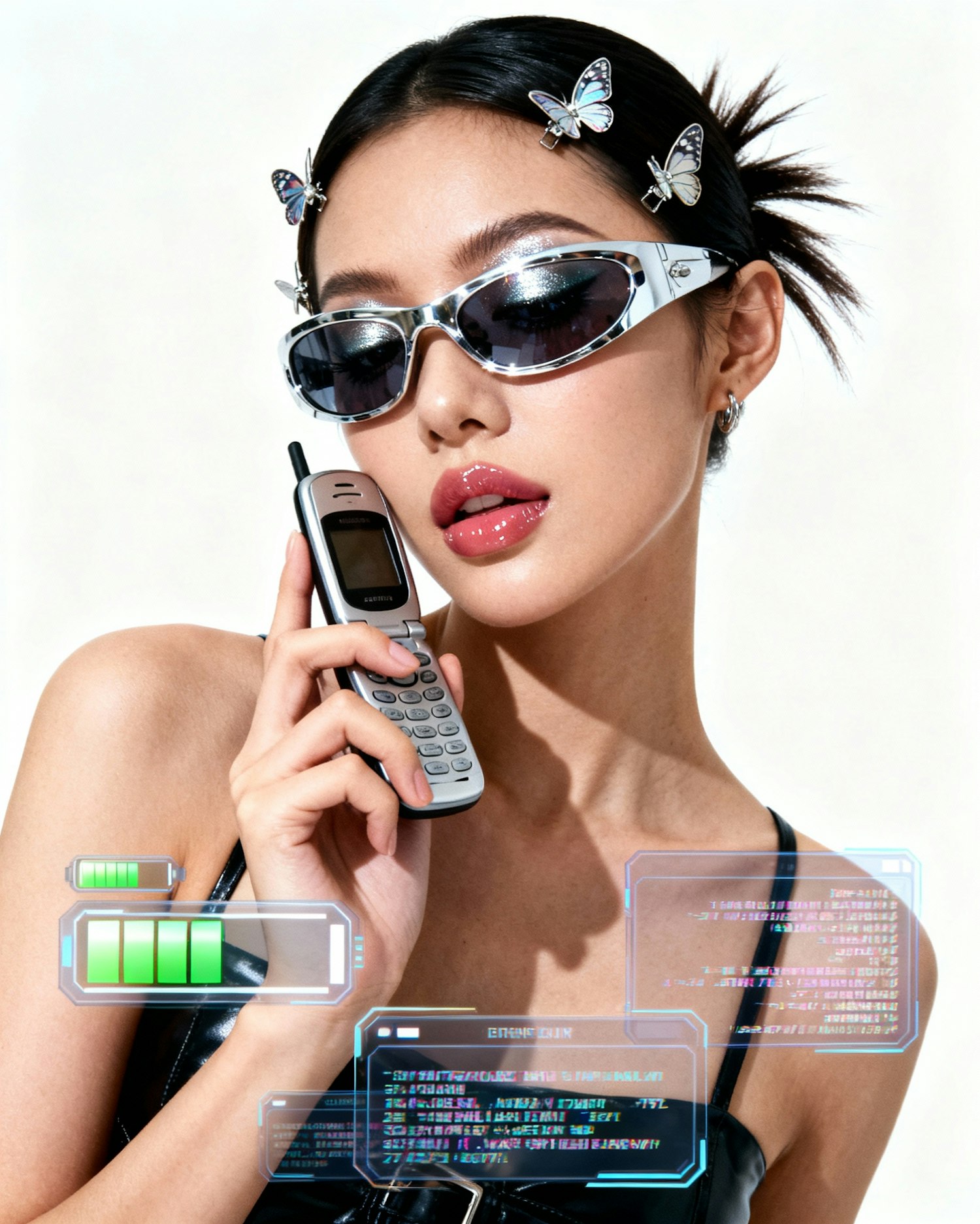 A fashionable person with butterfly clips and reflective sunglasses holds a retro flip phone, surrounded by digital interface graphics.