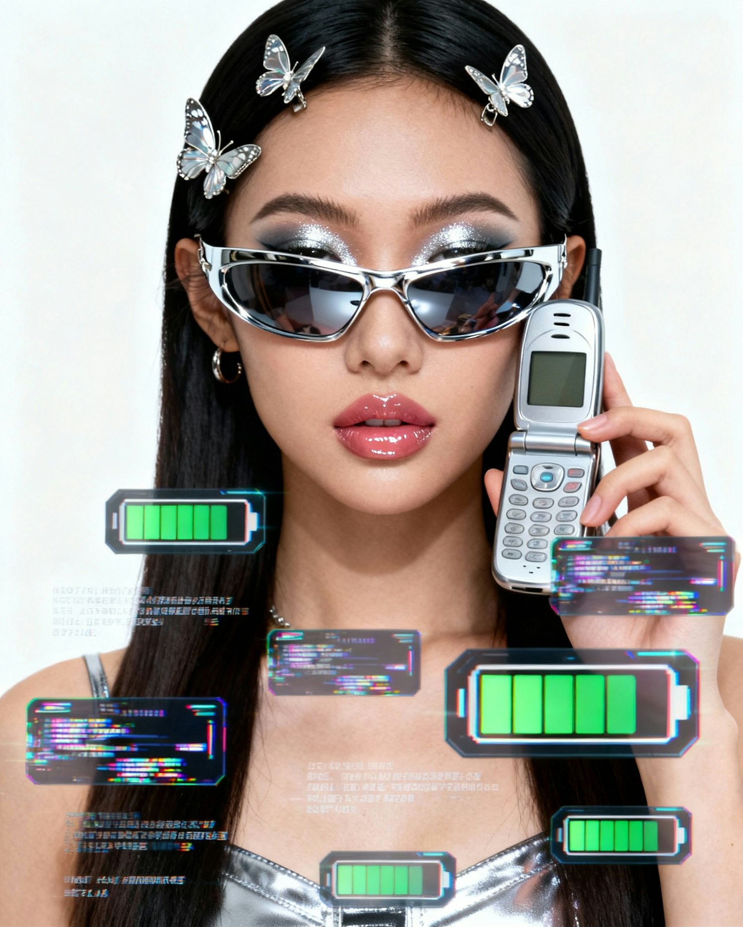 Female model in chrome sunglasses and metallic eyeshadow holding a flip phone to her face. Surrounded by floating UI pop-ups, battery icons, and glitch text. Styled with butterfly clips and glossy lips. White background, editorial flash lighting, hyper-detailed.