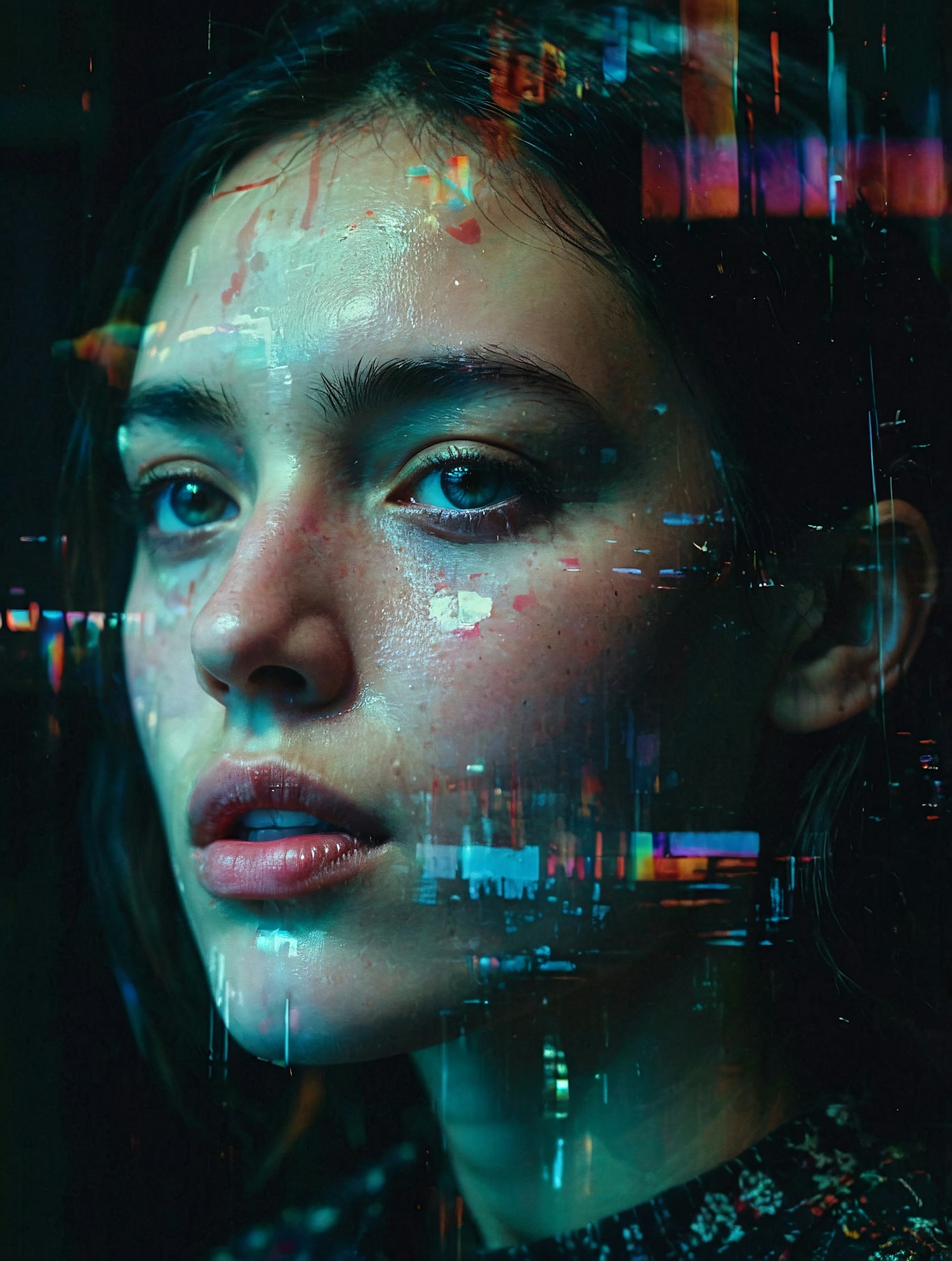 Close-up of a young woman with blue eyes and digital neon overlays, creating a cyberpunk aesthetic with glitch-like effects.