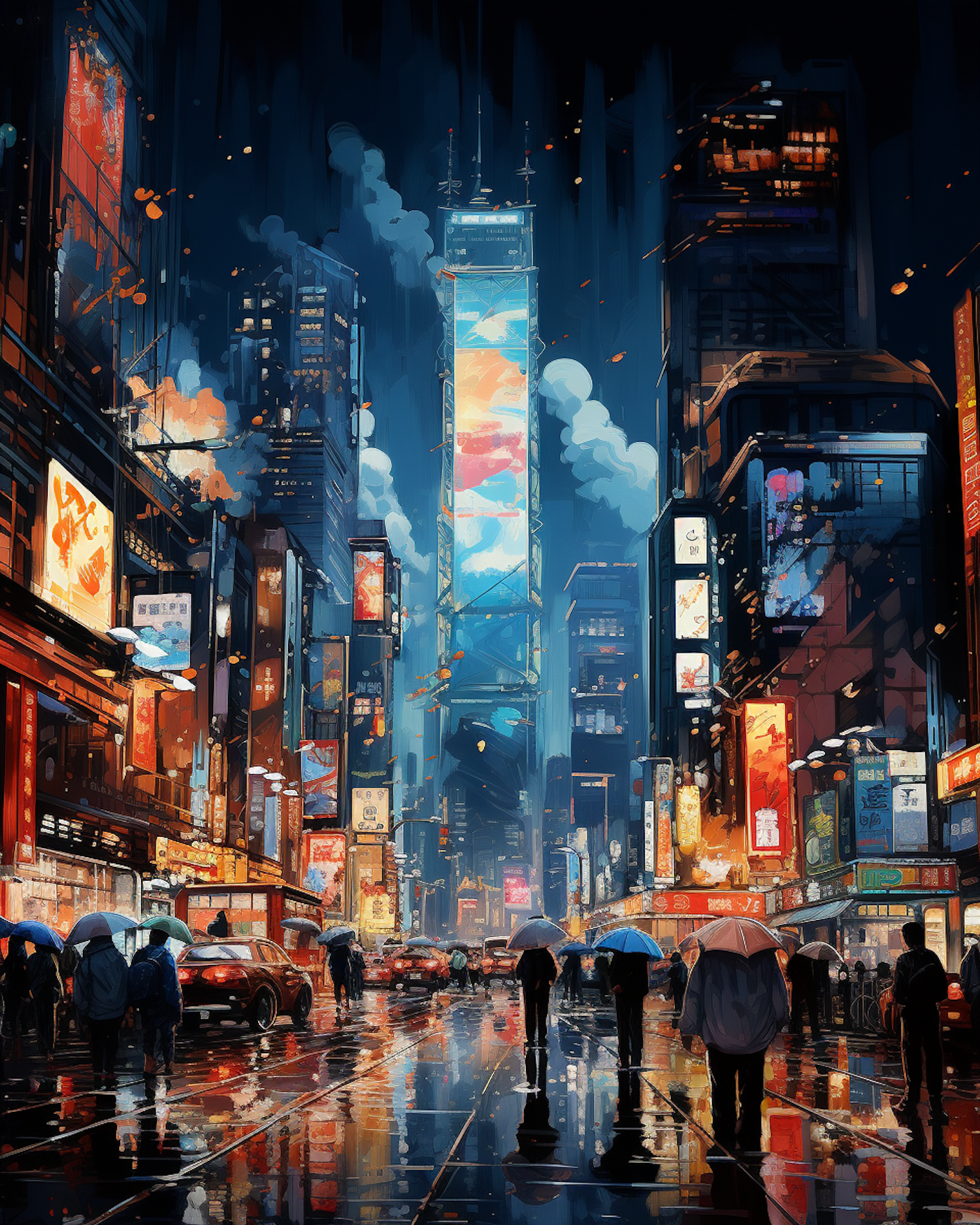 Vibrant cityscape at night with neon lights, wet streets, and people with umbrellas. A lively urban scene full of energy.