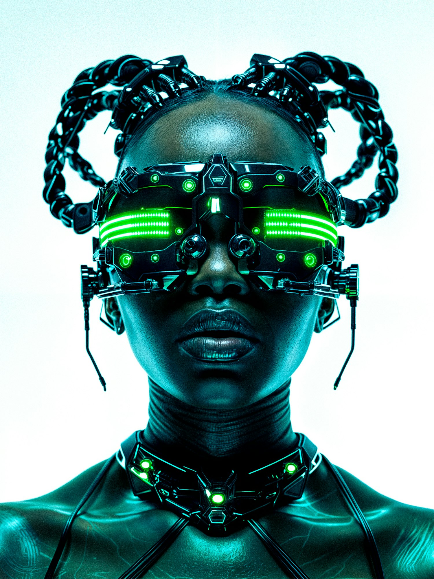 Futuristic portrait of a Black woman with glowing cybernetic goggles, braided metallic hair, and a high-tech choker in a cyberpunk style.
