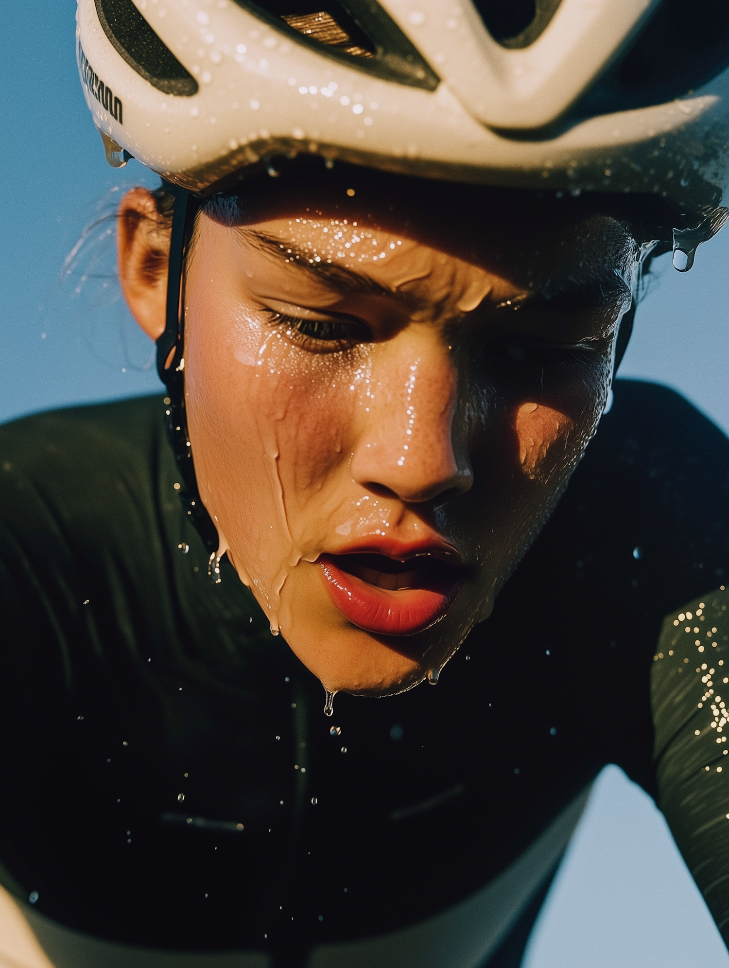 Close-up of a cyclist's intense expression, sweat glistening under a white helmet, set against a clear blue sky. Pure determination!