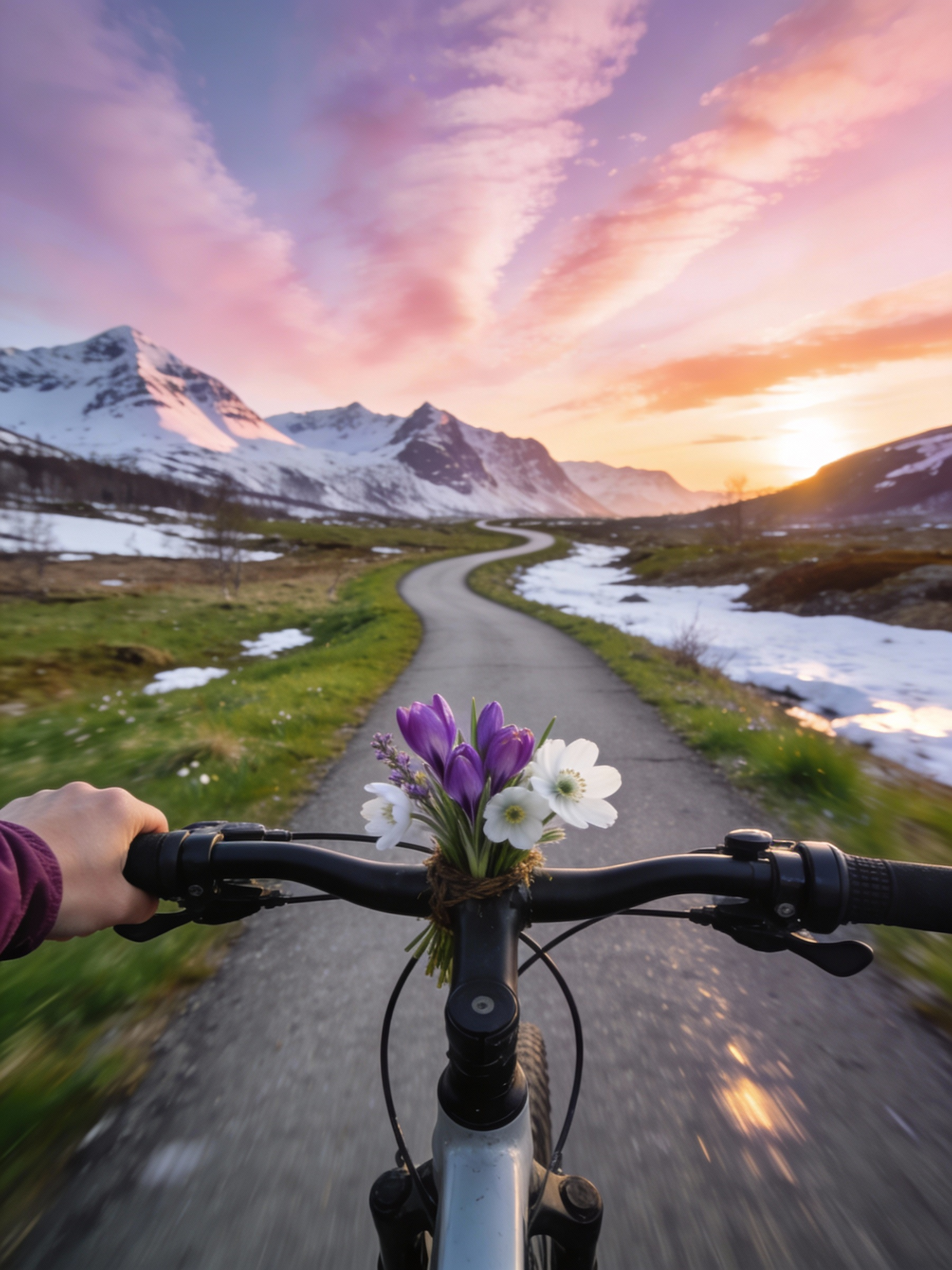 Ultra realistic cinematic 8K HDR photograph, first-person POV of a woman cycling along a narrow paved path near Tromsø, Norway, early spring Nordic meadows with fresh green growth and patches of melting snow beside the path, snow-covered mountains in the distance, soft pastel sunset with textured clouds, realistic handlebars in foreground, woman’s hand holding a small bouquet of early spring wildflowers, crisp cool air, subtle motion blur, vibrant natural colors, National Geographic style