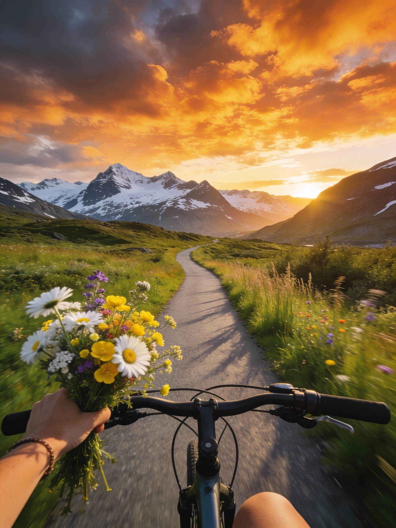Cycling through a vibrant valley at sunset, holding a bouquet of wildflowers, with snow-capped mountains and a glowing sky in the distance.