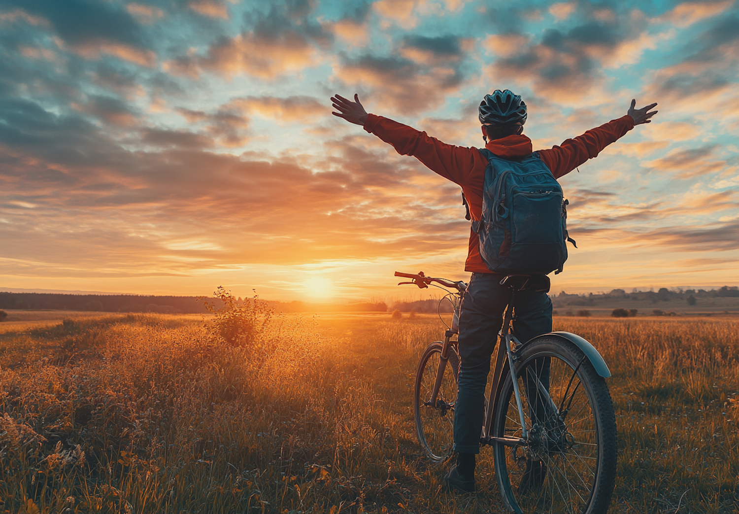 Caucasian male cyclist in red jacket celebrates sunset on grassy field, arms wide open, vibrant sky, sense of freedom and adventure.