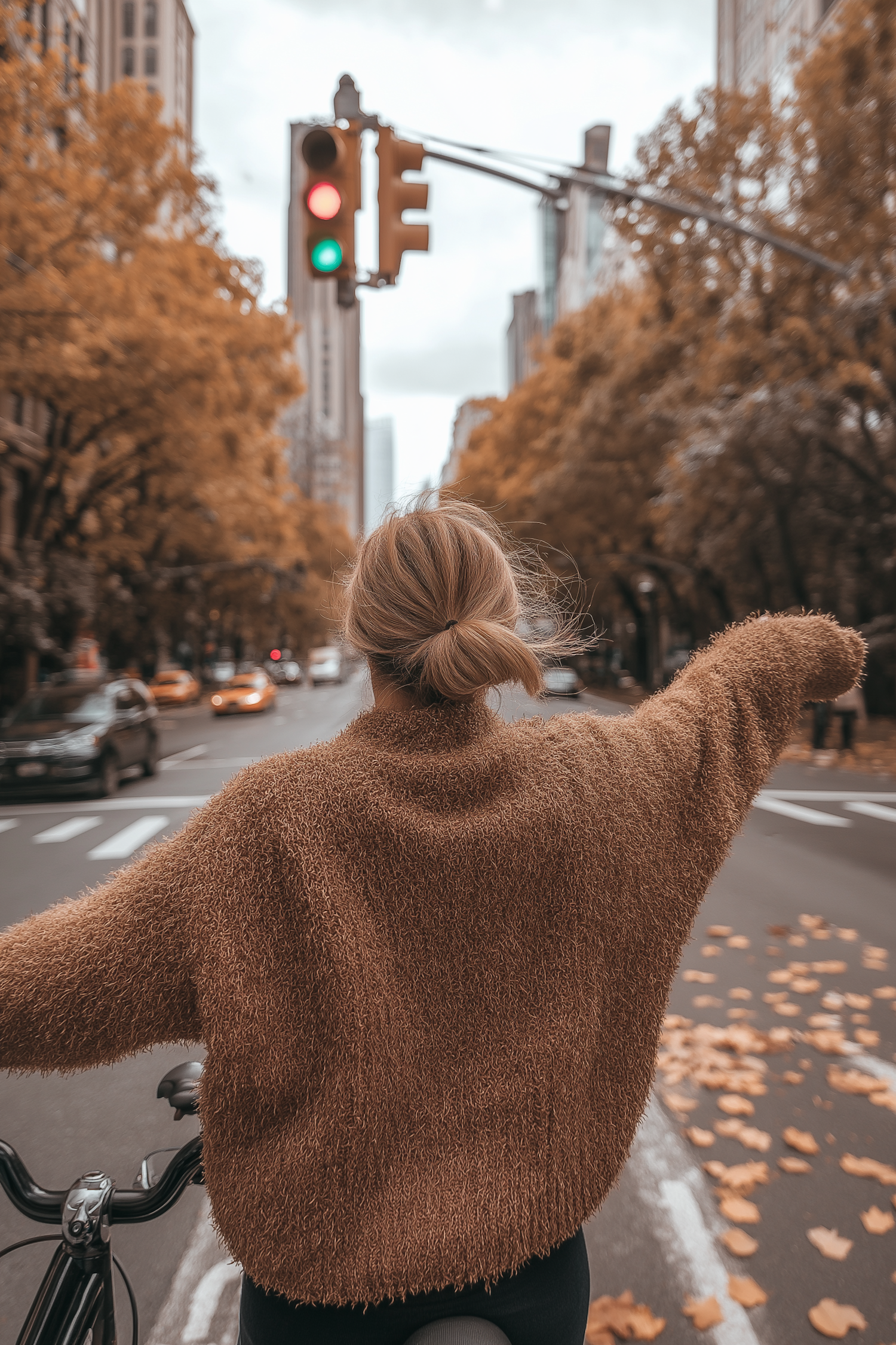 Person cycling in autumn city street, wearing a brown sweater, surrounded by golden leaves and urban buildings.