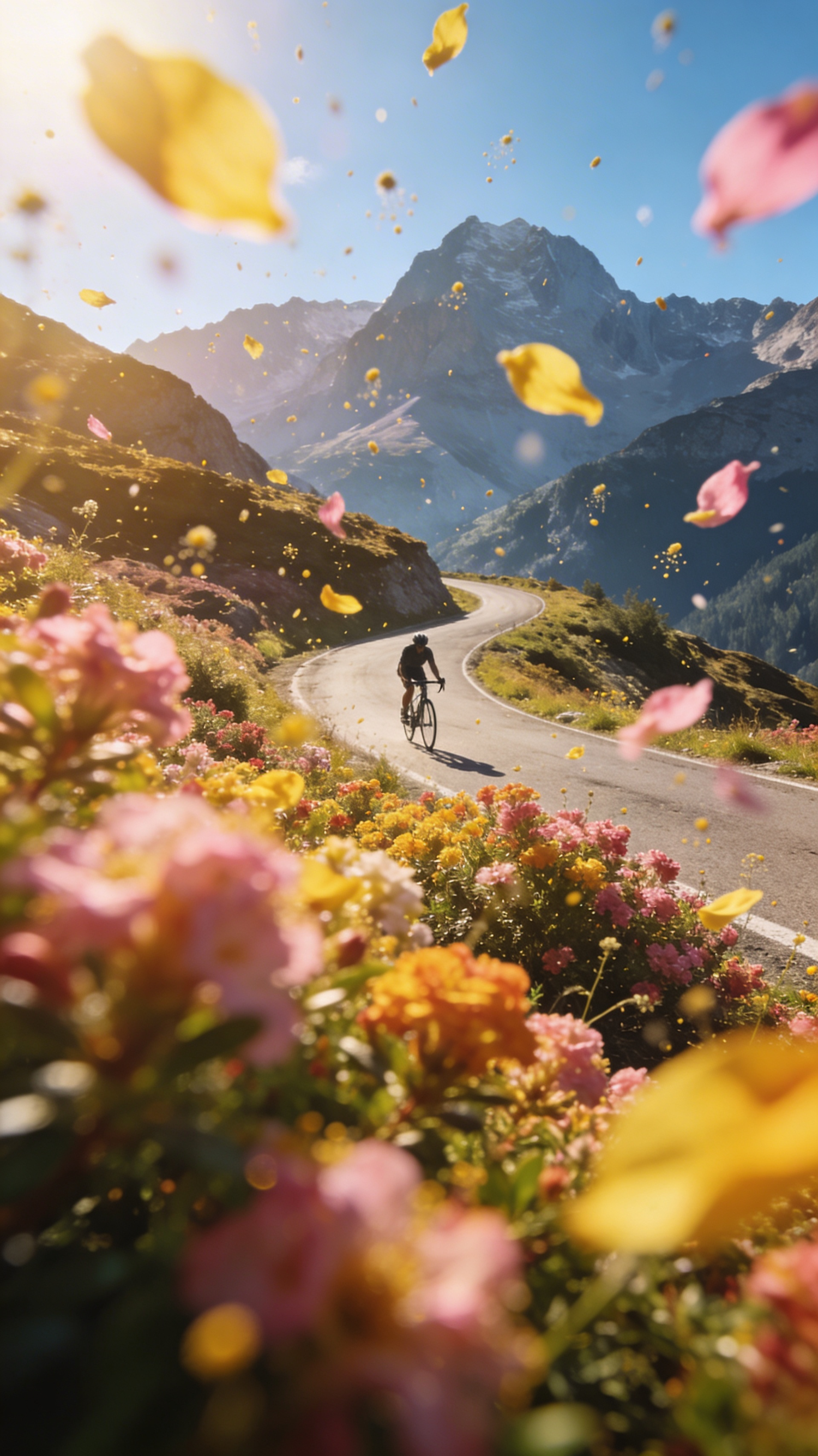 A cyclist rides through a vibrant mountain landscape with colorful flowers and majestic peaks, creating a serene and dynamic scene.