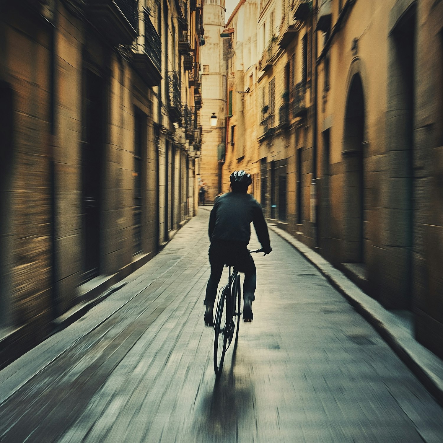Cyclist rides through a narrow, cobblestone street in a historic European city, surrounded by warm-toned buildings and soft lighting.
