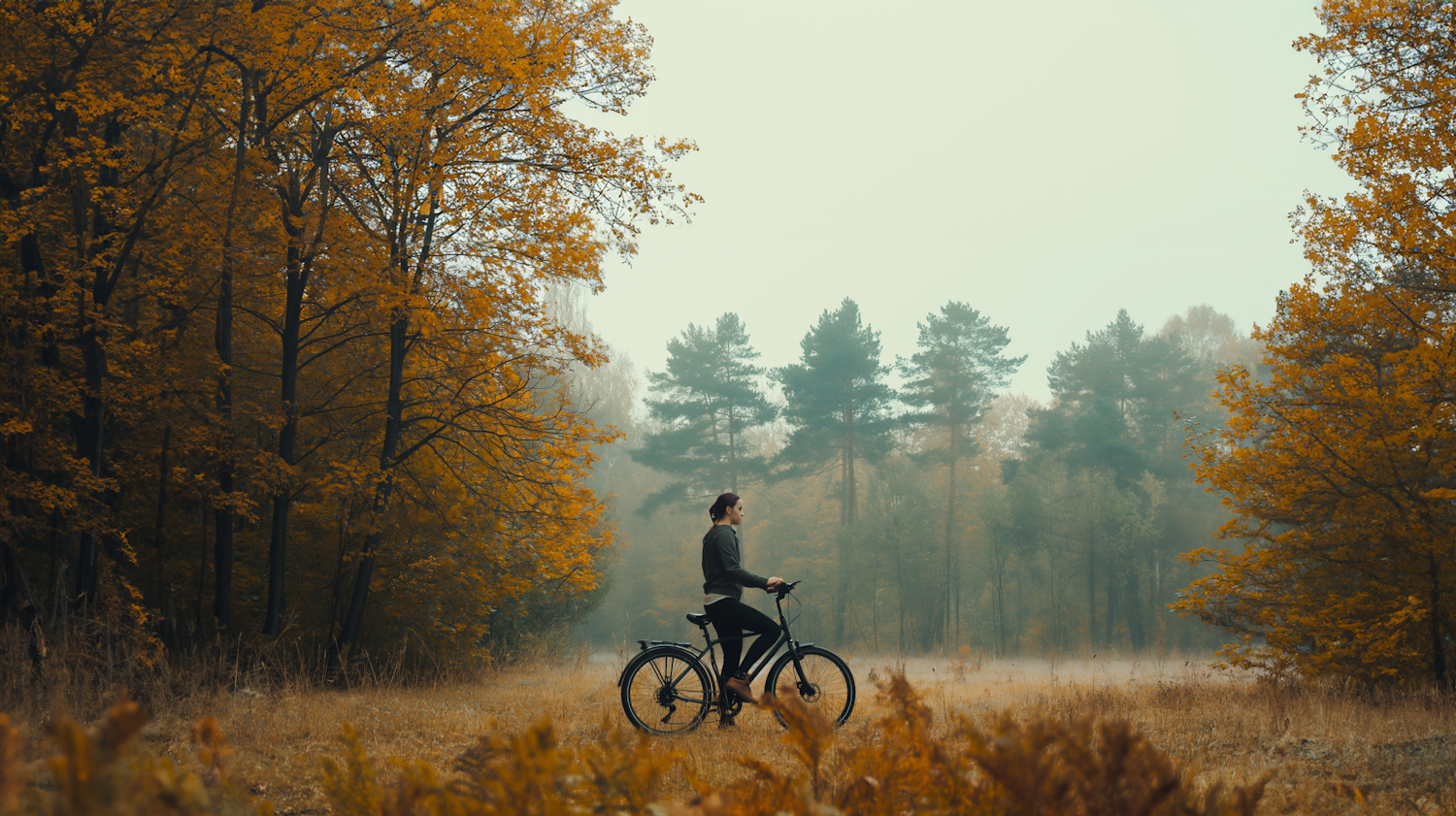 Person with bicycle in misty autumn forest, surrounded by golden leaves and tall trees, creating a serene and reflective atmosphere.