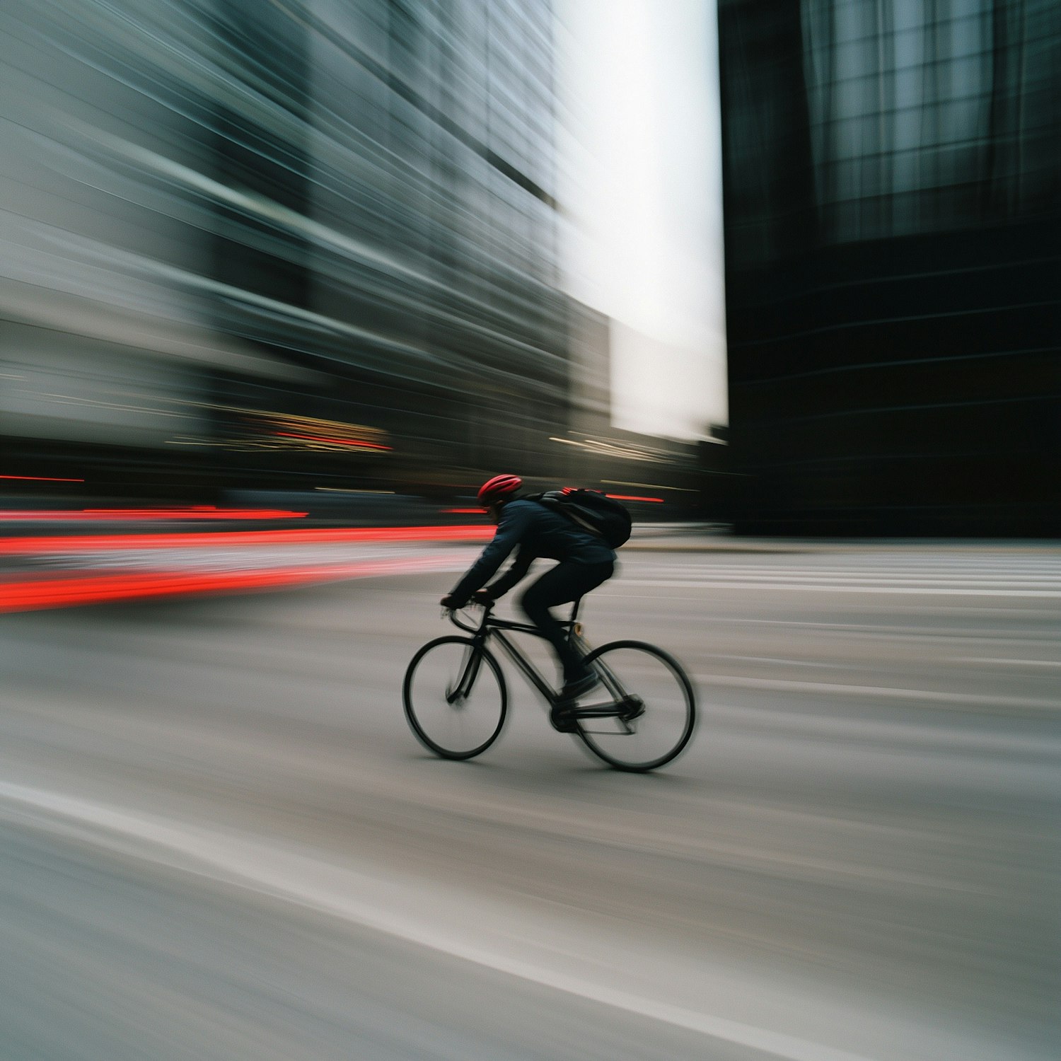 Cyclist in a red helmet speeds through a city street, with motion blur and red light streaks creating a dynamic urban vibe.
