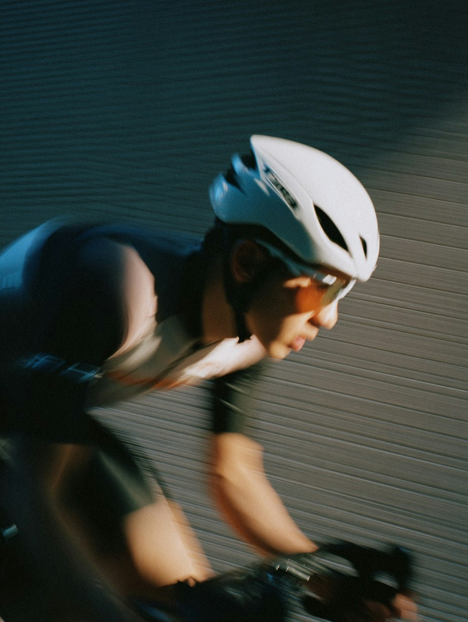 A cyclist in motion, wearing a white helmet and sunglasses, captured with a blurred background to emphasize speed and focus.