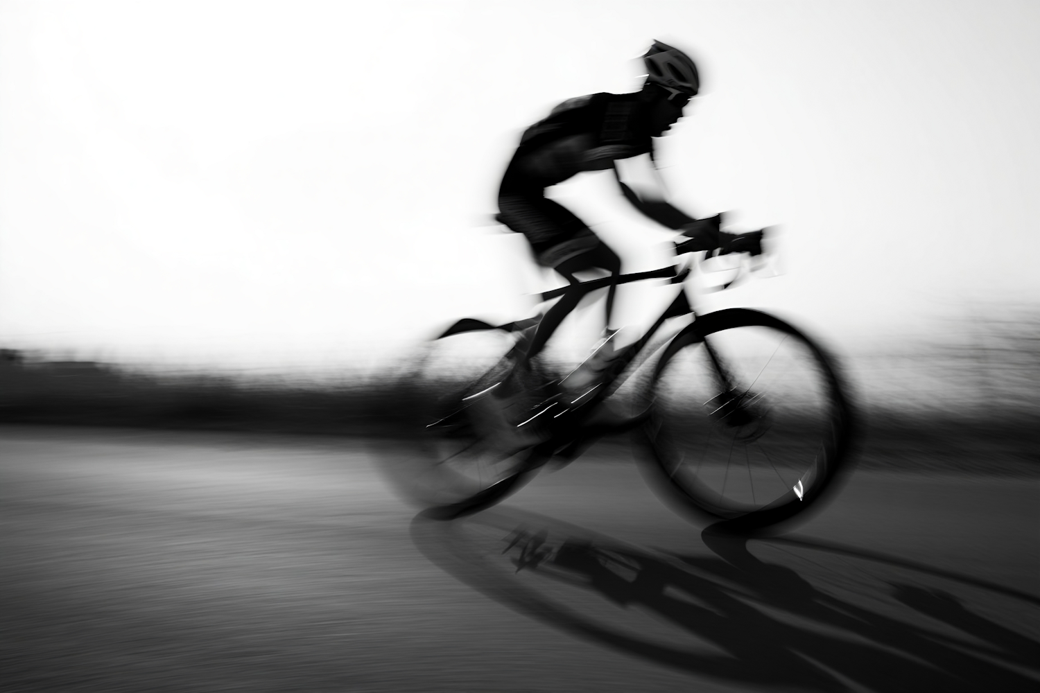 Dynamic black-and-white shot of a cyclist in motion, with motion blur emphasizing speed and energy against a bright, minimal background.