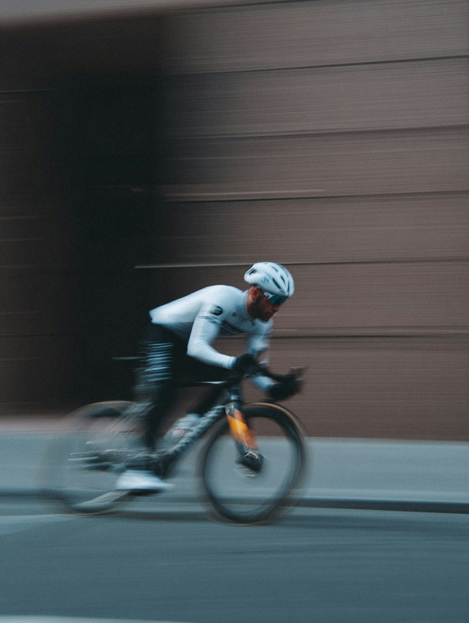 A cyclist in motion, wearing a white jersey and helmet, rides a sleek black bike with orange accents against a blurred urban backdrop.