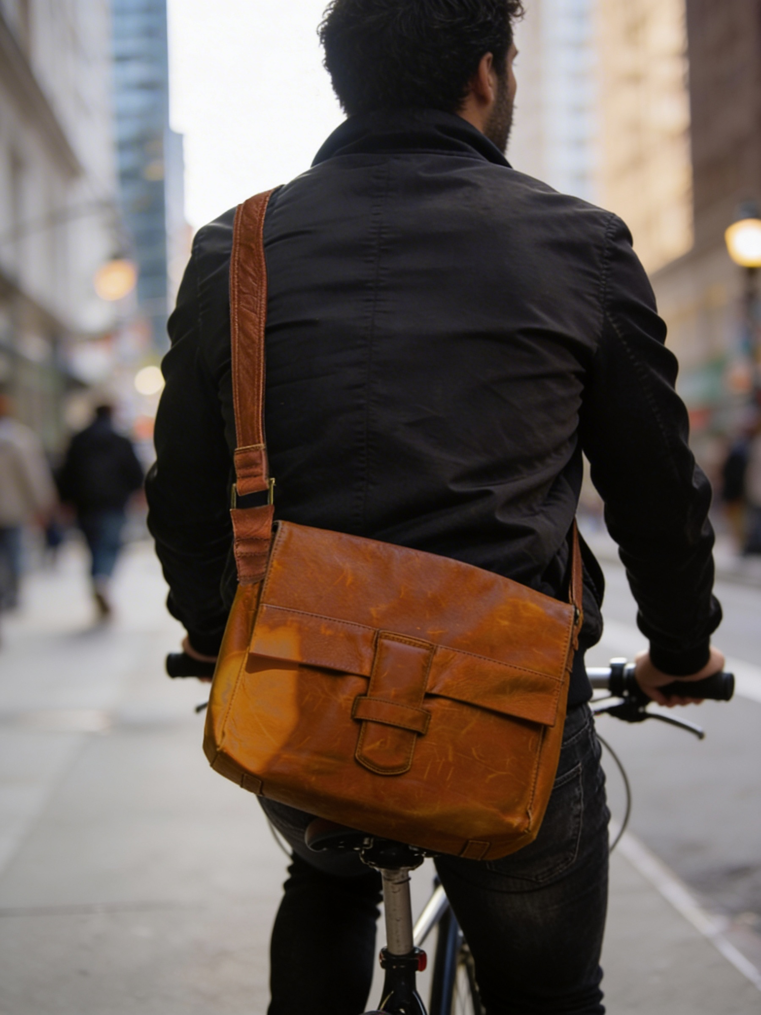 A cyclist in a black jacket rides through a city street, carrying a stylish brown leather satchel. Urban life in motion.