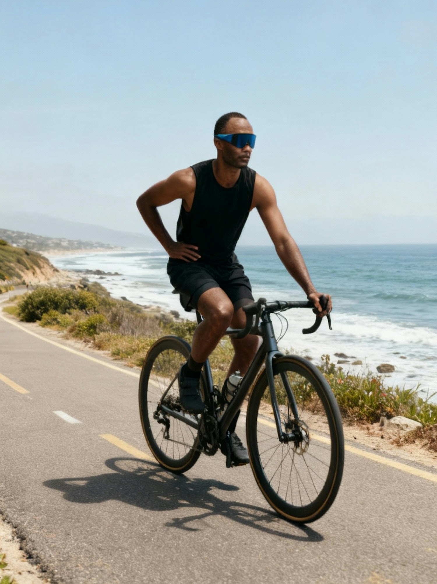 A cyclist rides along a scenic coastal road, wearing sporty attire and sunglasses, with the ocean and greenery creating a serene backdrop.