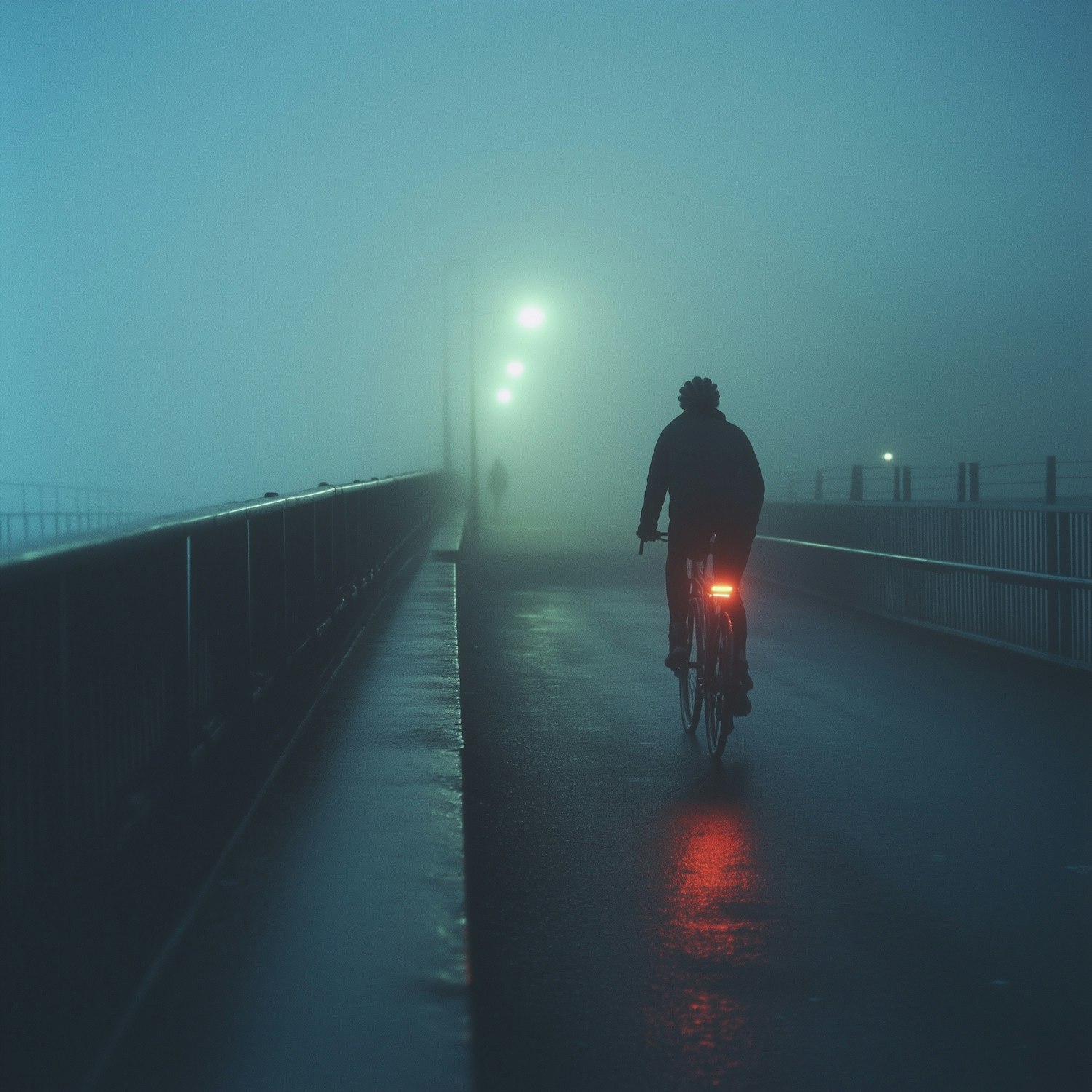 Cyclist on a foggy bridge at night, with glowing streetlights and a red bike light reflecting on the wet pavement. Mysterious and serene.