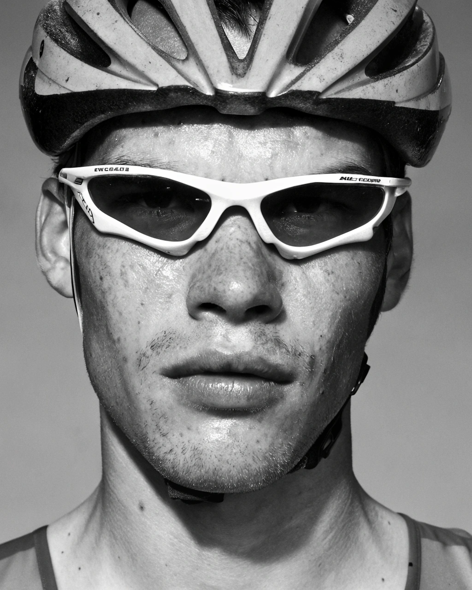 Close-up black-and-white portrait of a cyclist wearing a helmet and sunglasses, showcasing determination and focus.