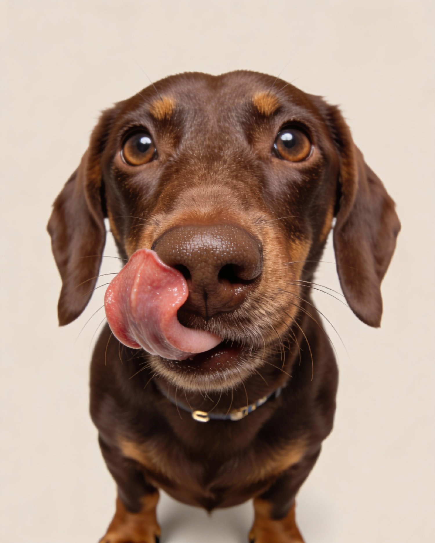 Ultra realistic studio pet photography, cold beige seamless background, clean minimal composition, soft diffused studio lighting, subtle natural shadows under the dog, high detail fur texture, visible whiskers, realistic nose texture, sharp focus on eyes, high-end commercial photography, 85mm lens look, f/4 depth of field, crisp details, no text, no logo, no collar, no props, Front-facing close-up portrait, dog licking its nose with small tongue curling to the side, funny candid moment, eyes wide, centered headshot, breed: Dachshund (short-haired chocolate brown), paws barely visible at bottom edge, sharp focus