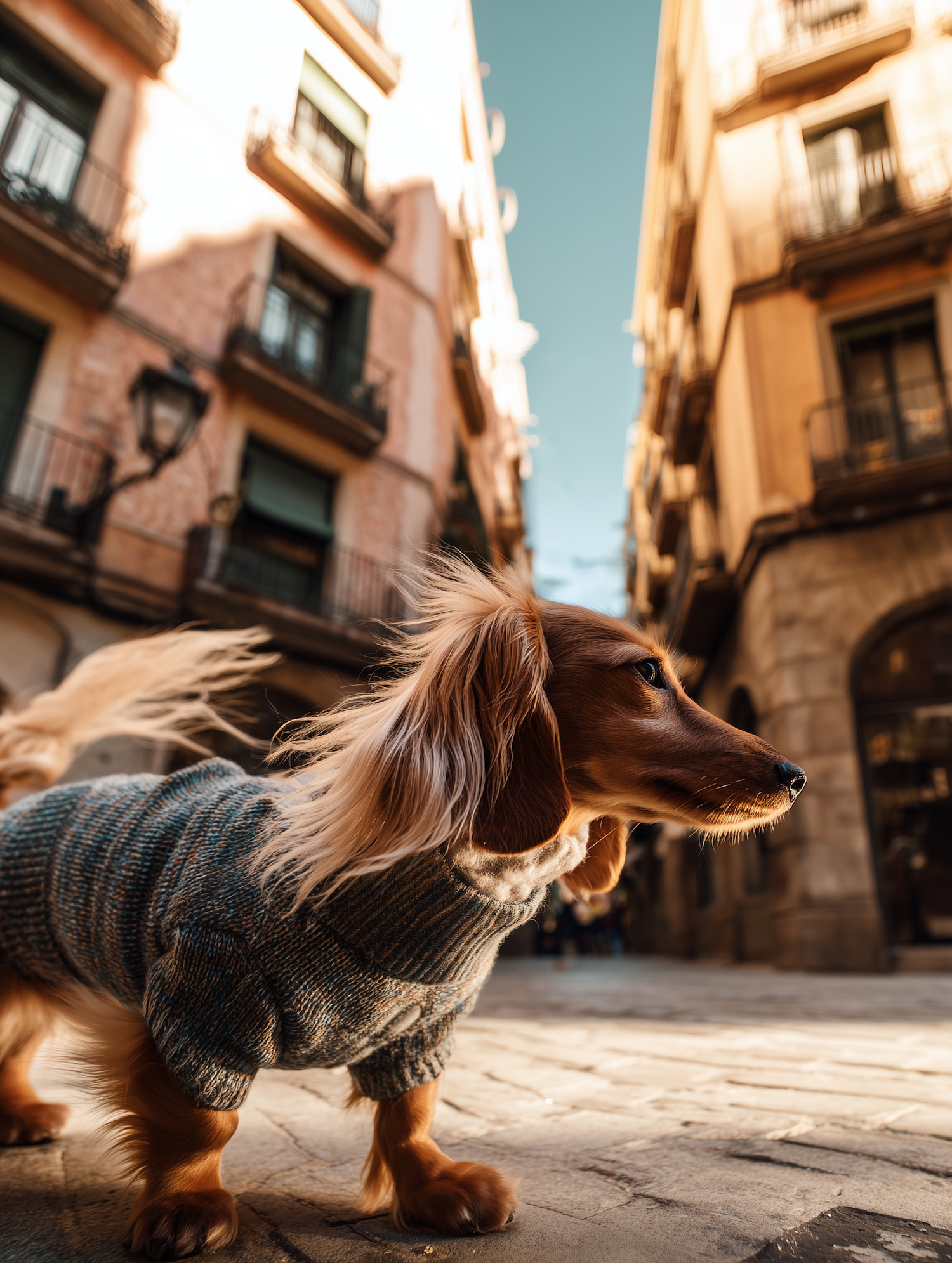 Adorable dachshund in a cozy sweater on a sunny cobblestone street, surrounded by charming urban architecture.