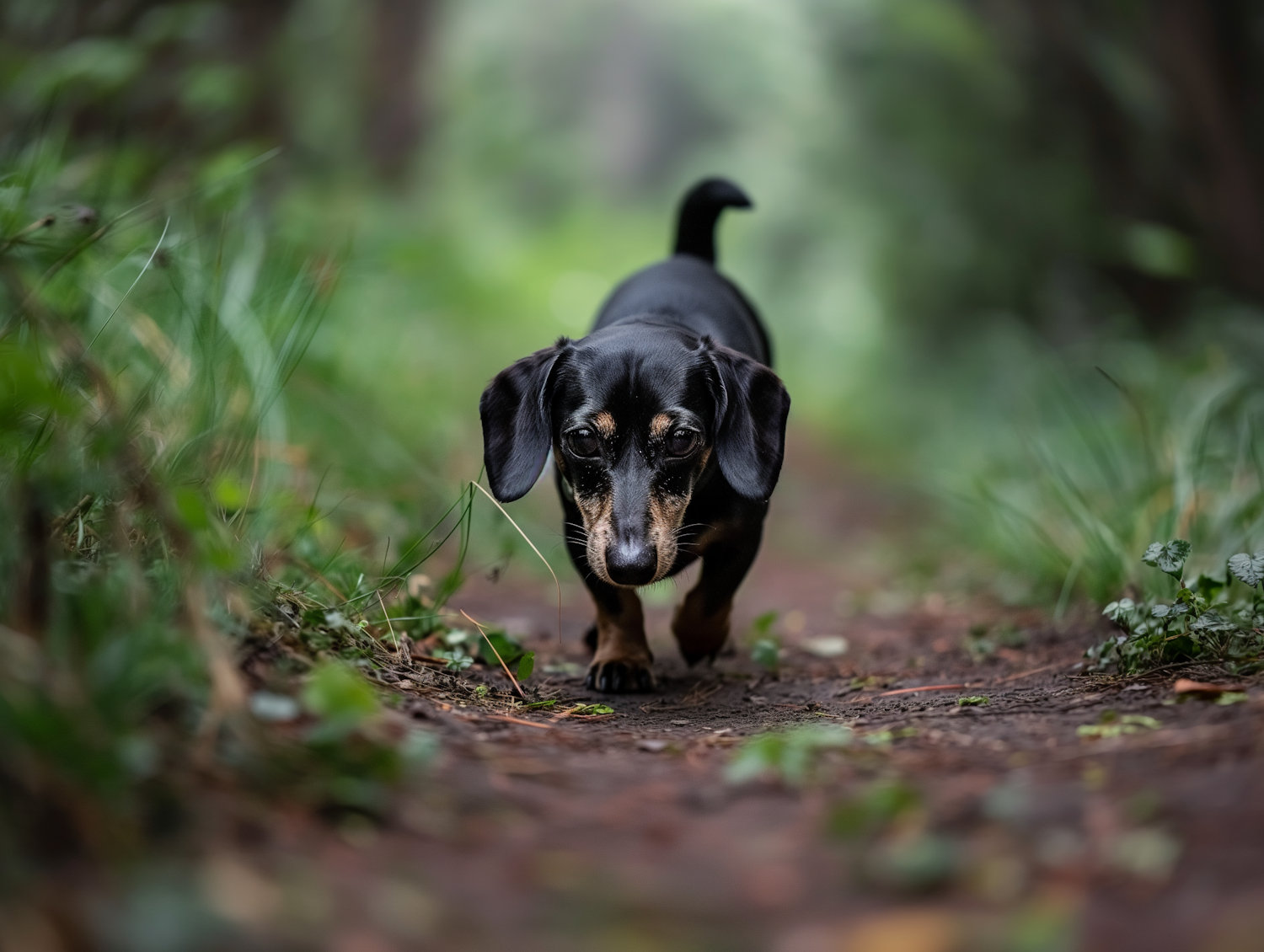 Adorable dachshund walking on a lush green path, surrounded by nature. Perfect capture of a curious pup exploring the outdoors.