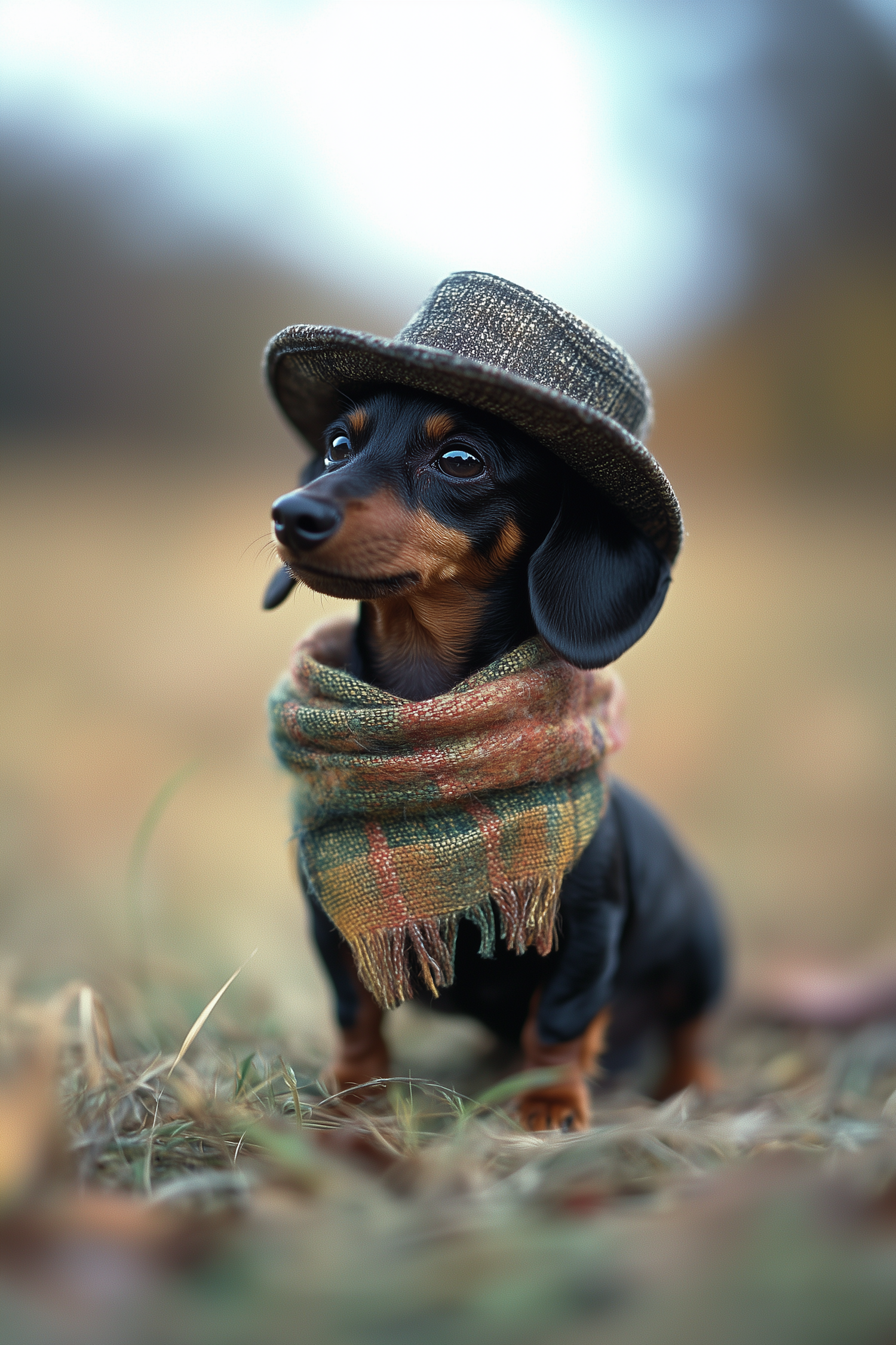 Adorable dachshund in a plaid scarf and tweed hat, standing in a grassy field. Perfect blend of style and cuteness.