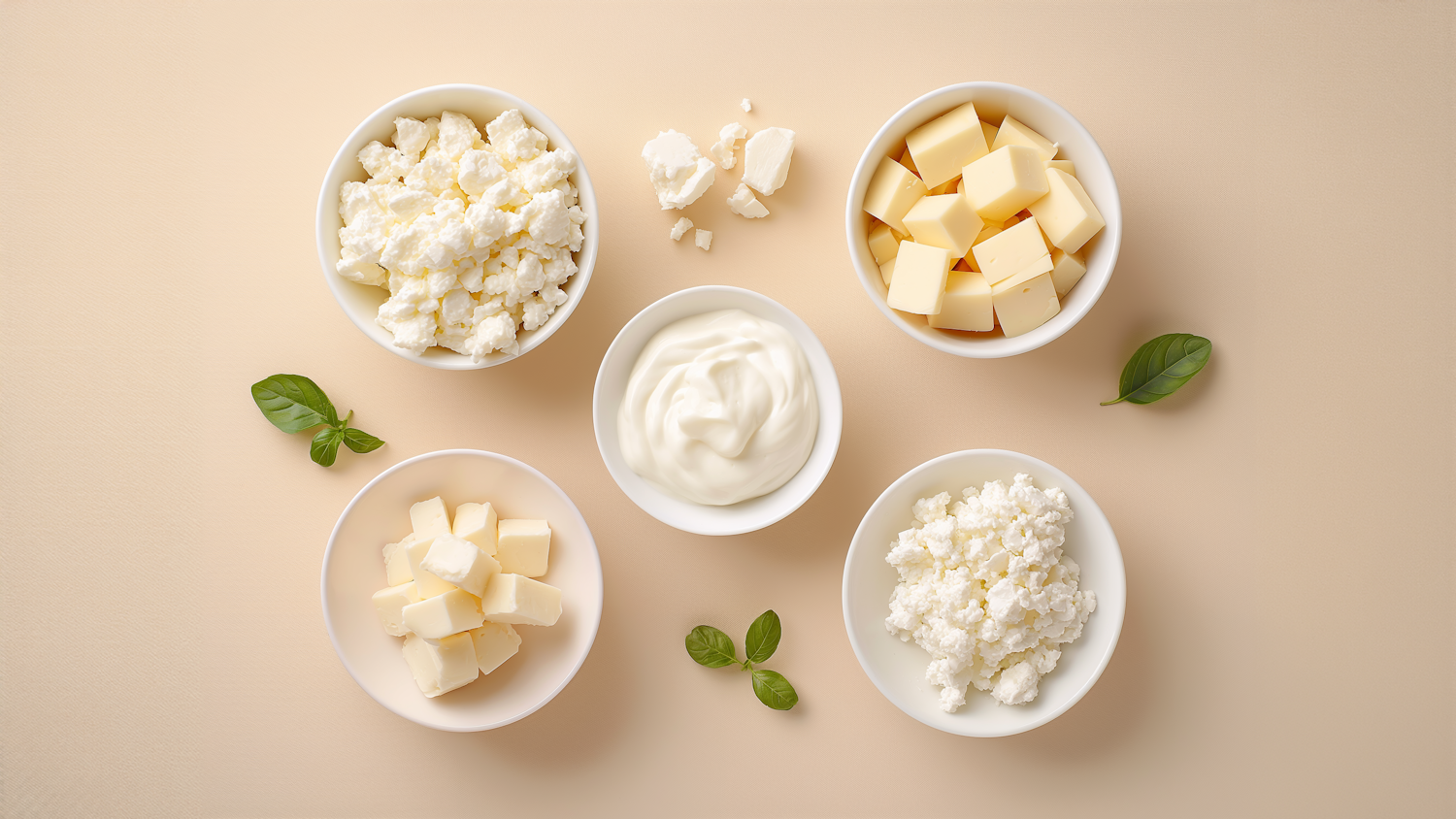 Assorted dairy products in bowls with fresh basil leaves on a beige background, showcasing cheese, yogurt, and butter.