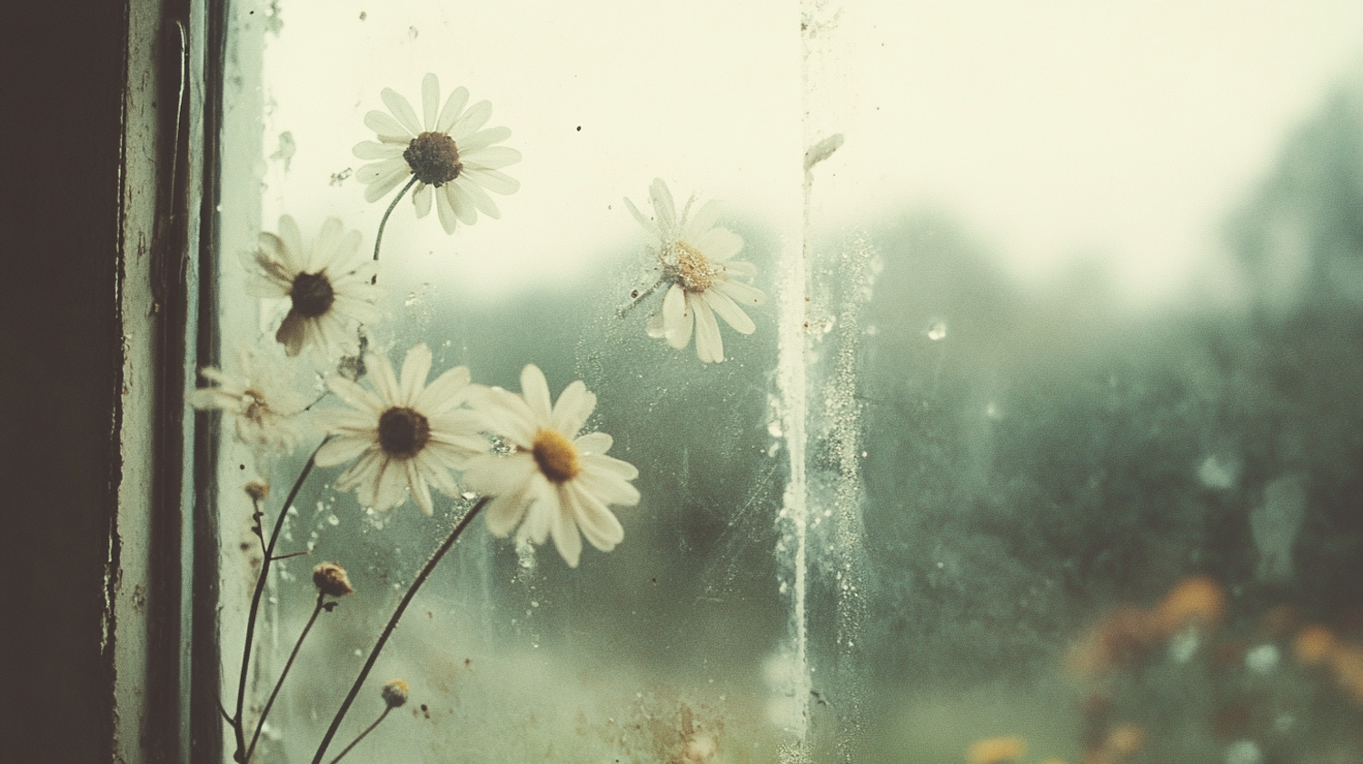 White daisies against a foggy, weathered windowpane create a nostalgic and tranquil scene with a soft, muted color palette.