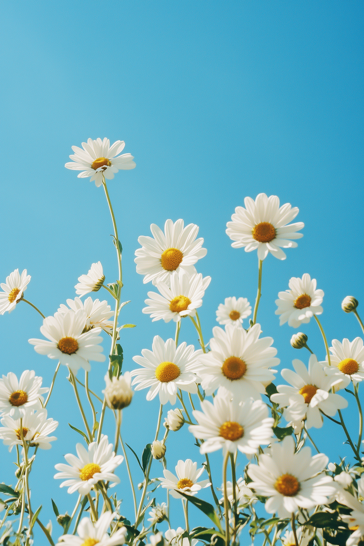 Bright white daisies with yellow centers against a clear blue sky, creating a fresh and cheerful nature scene.